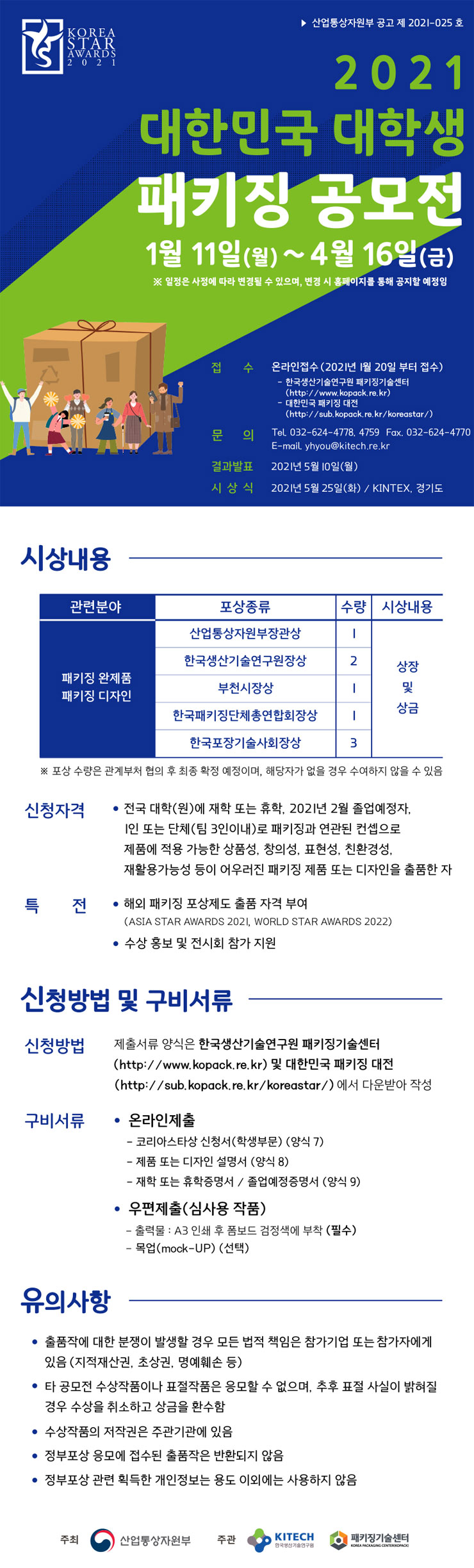 - 전국 대학(원)에 재학 또는 휴학, 2021년 2월 졸업예정자, 1인 또는 단체(팀 3인이내)로 패키징과 연관된 컨셉으로 제품에 적용 가능한 상품성, 창의성, 표현성, 친환경성, 재활용가능성 등이 어우러진 패키징 제품 또는 디자인을 출품한 자