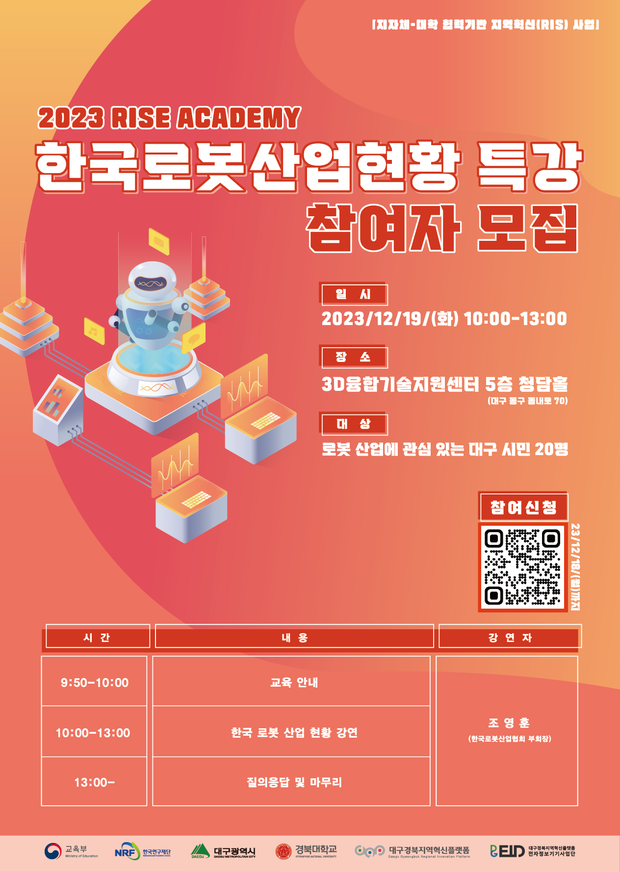 "2023년 「RISE 아카데미」 - 한국 로봇 산업 현황" 특강이 진행되오니 로봇 산업에 관심 있는 대구 시민들의 많은 참여 바랍니다.
