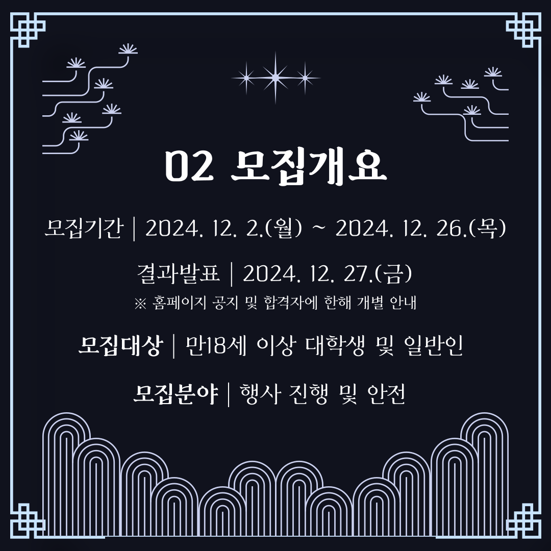 ○ 결과발표 : 2024. 12. 27.(금) *홈페이지 공지 및 합격자에 한해 개별 통보