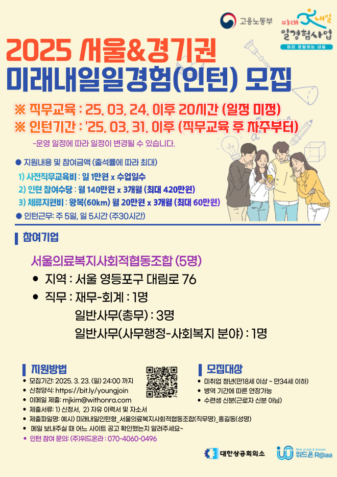 서울의료복지사회적협동조합 2025년 미래내일 일경험 인턴형 모집합니다.