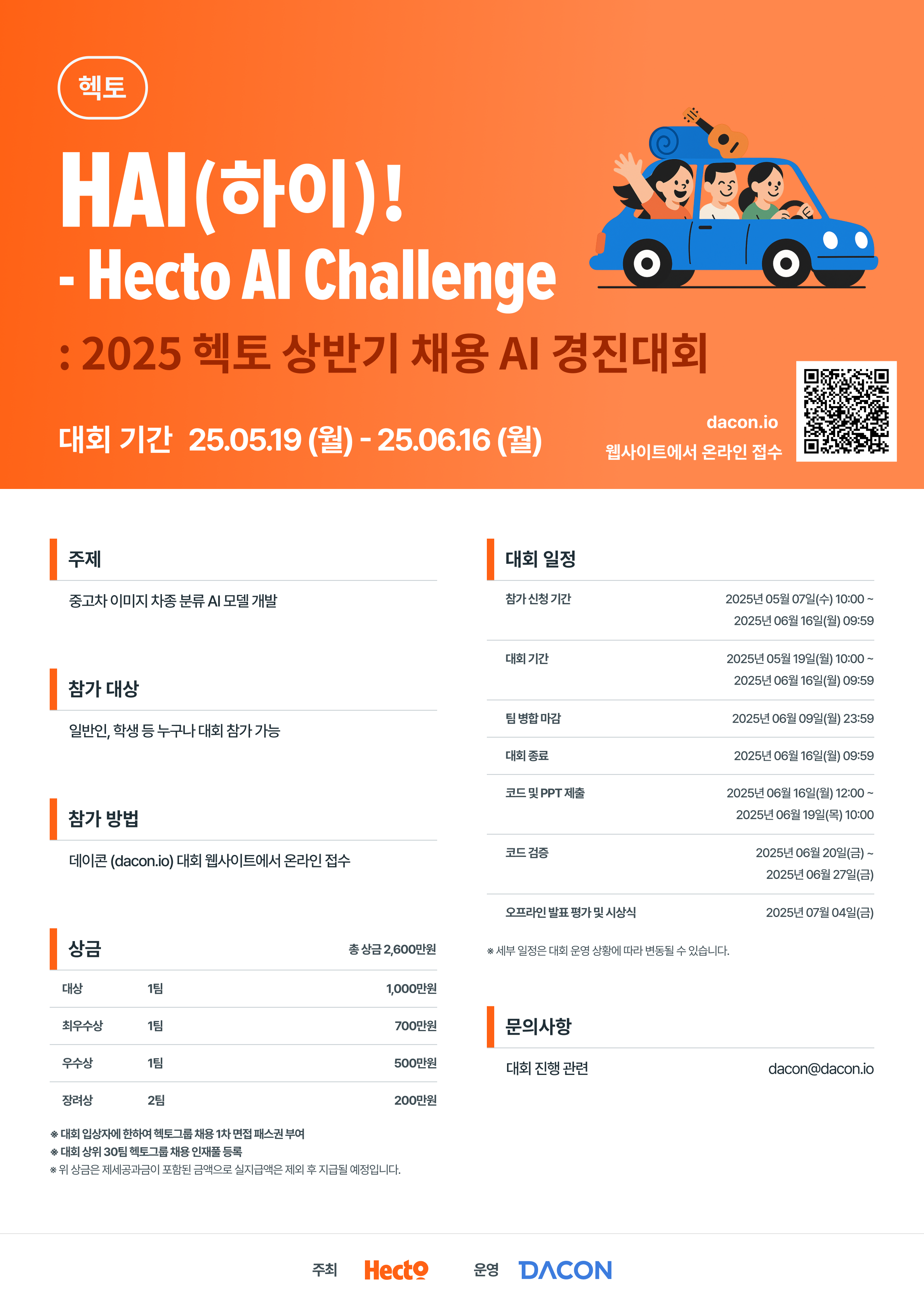 이에 따라, ‘HAI(하이)! - Hecto AI Challenge : 2025 상반기 헥토 채용 AI 경진대회’는 실제 중고차 차량 이미지를 기반으로 한 차종 분류 AI 모델 개발을 주제로 개최됩니다.