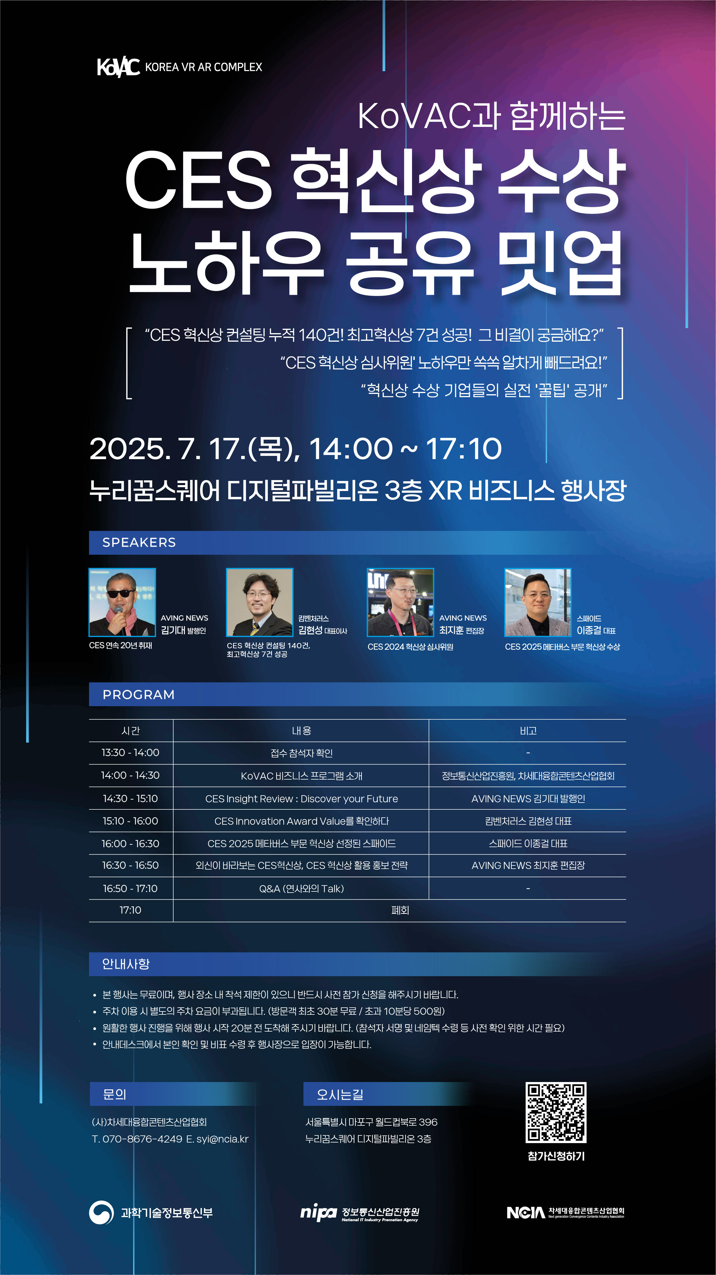 7월 17일(목) KoVAC 디지털파빌리온 3층 XR 비즈니스 행사장에서 개최되는 "KoVAC과 함께하는 CES 혁신상 수상 노하우 공유 밋업"을 안내드립니다.