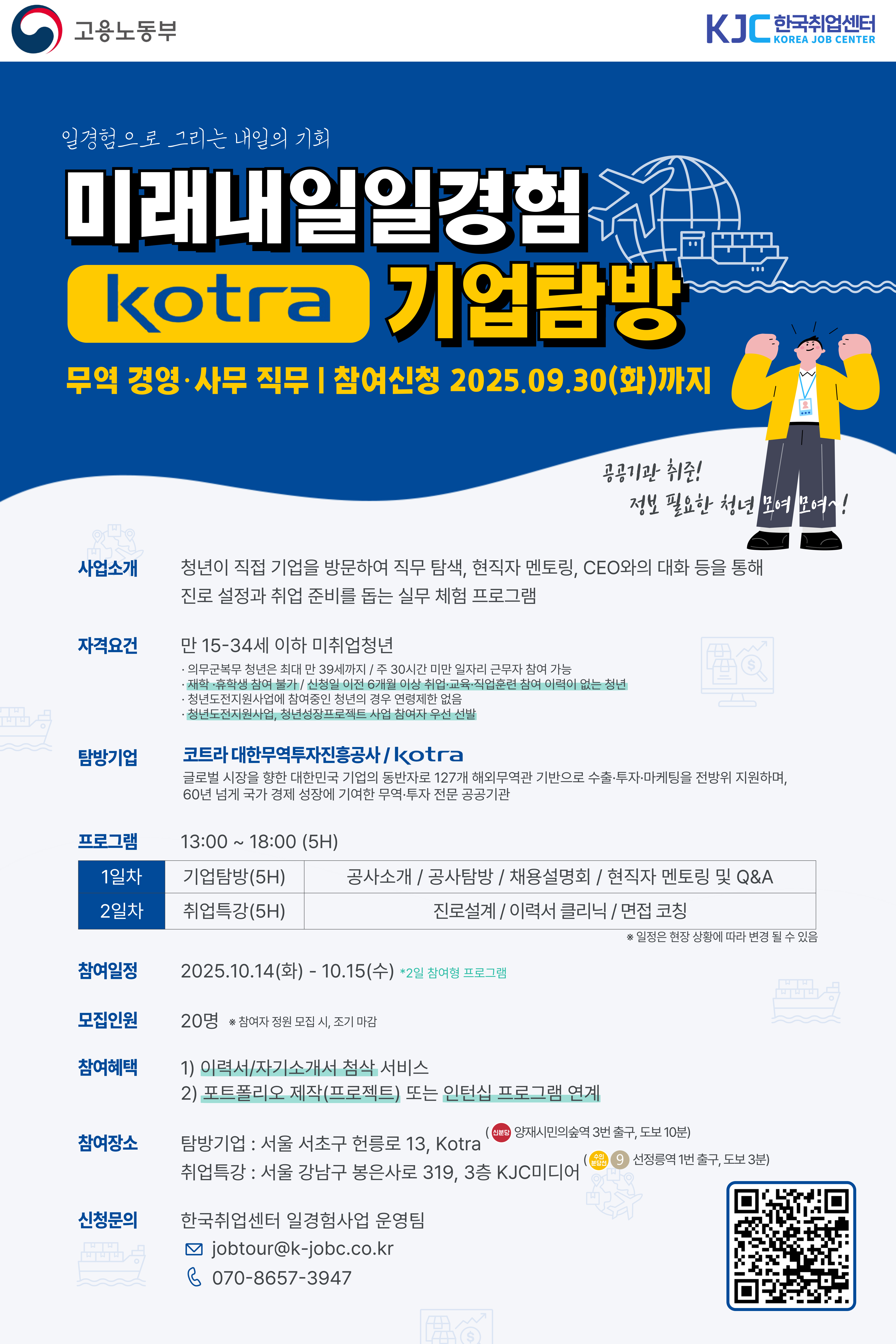 [고용노동부] 미래내일 일경험 공공기관 Kotra 기업탐방, 무역/경영·사무 직무 참여 청년 모집