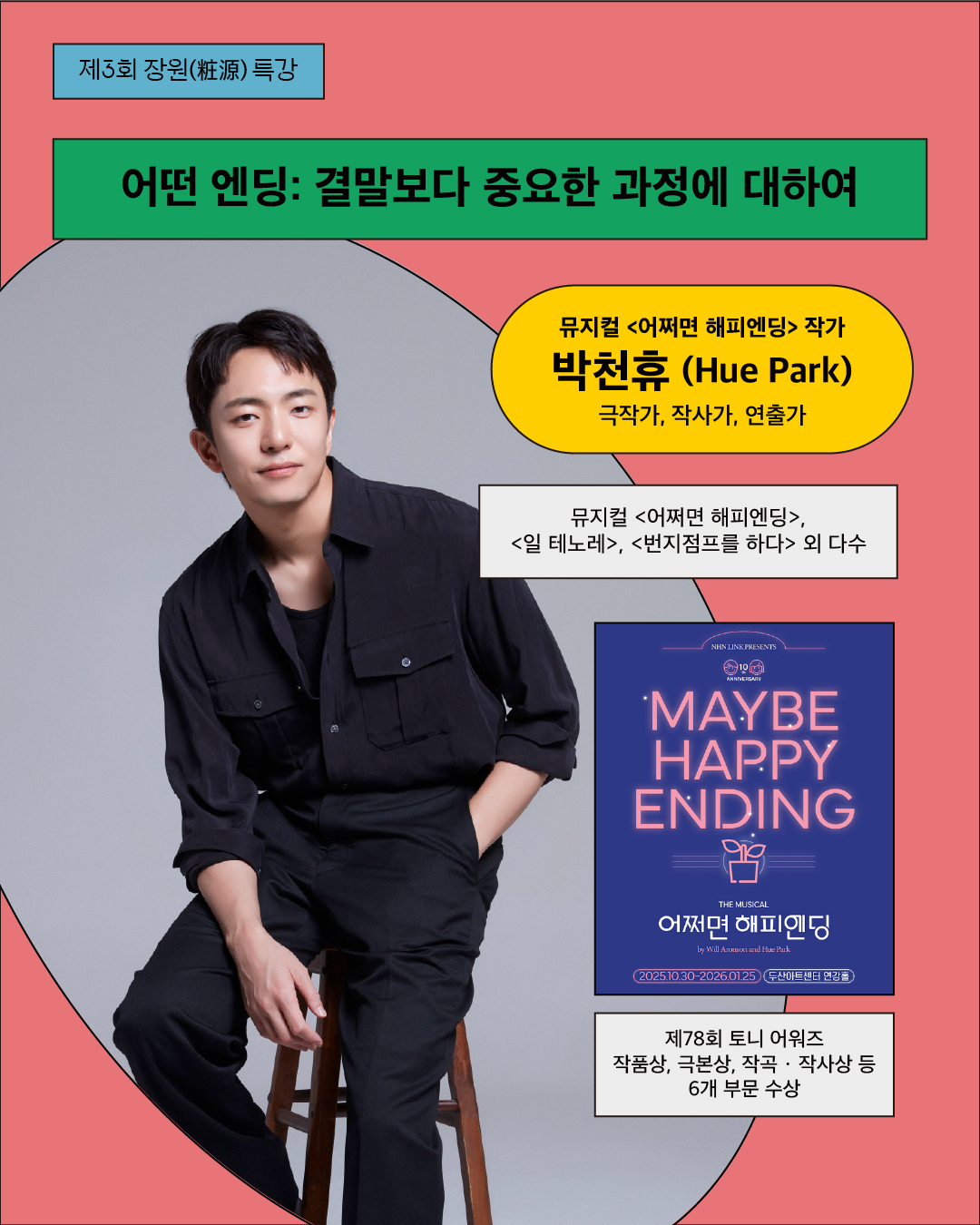 오는 11월 26일(수) 오후 7시에 열리는 '제3회 장원(粧源) 특강'은 뮤지컬 <어쩌면 해피엔딩>의 박천휴 작가와 함께 합니다.