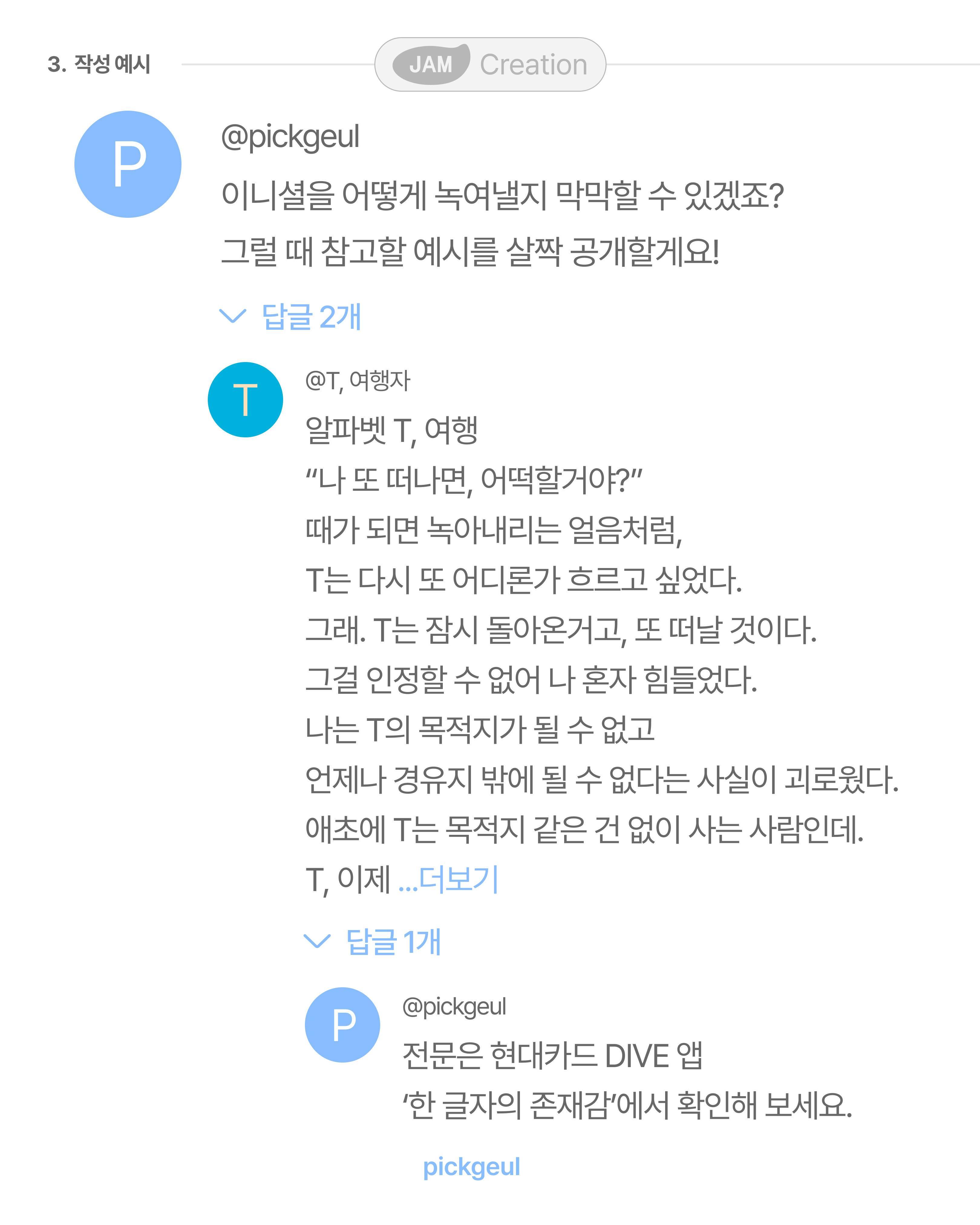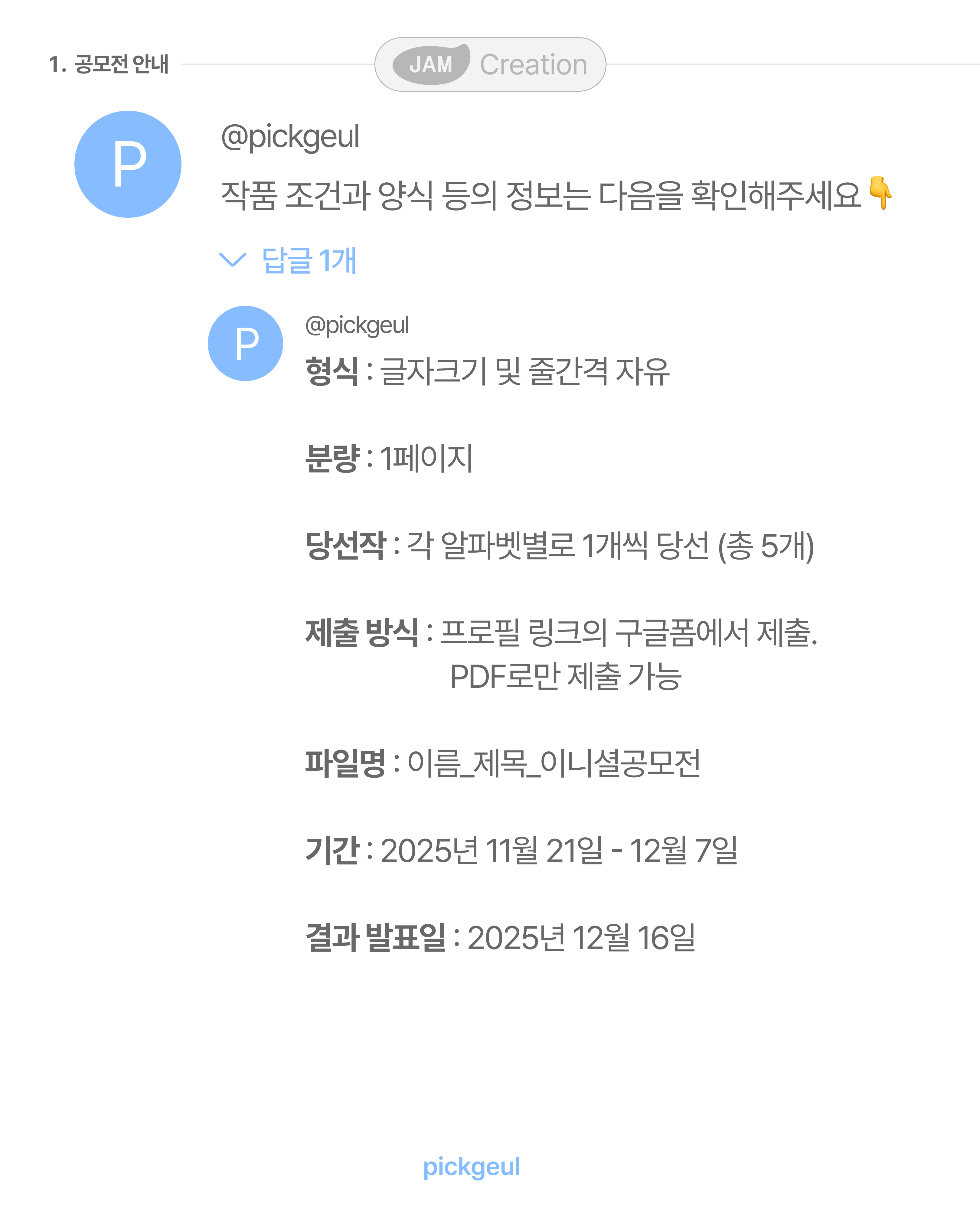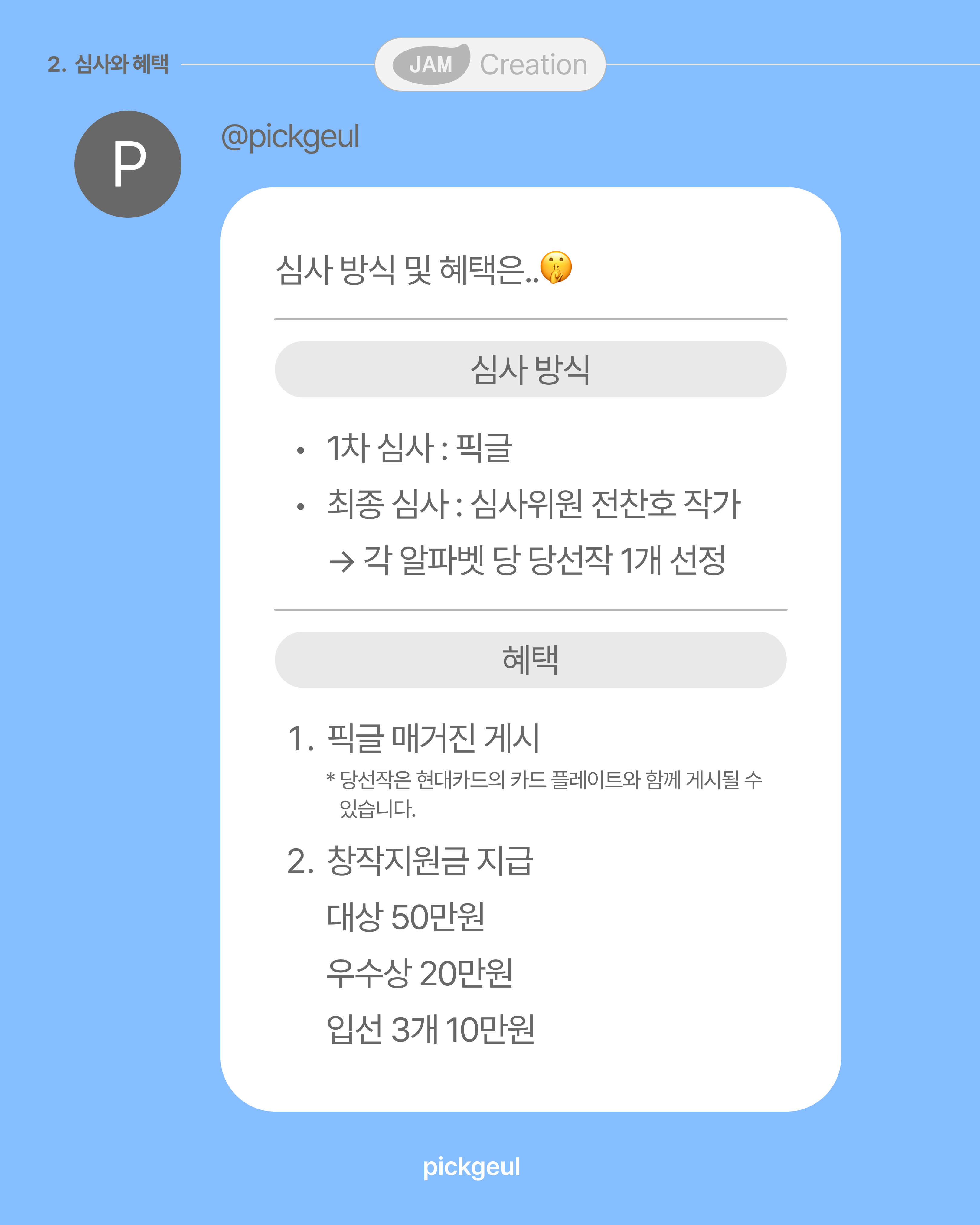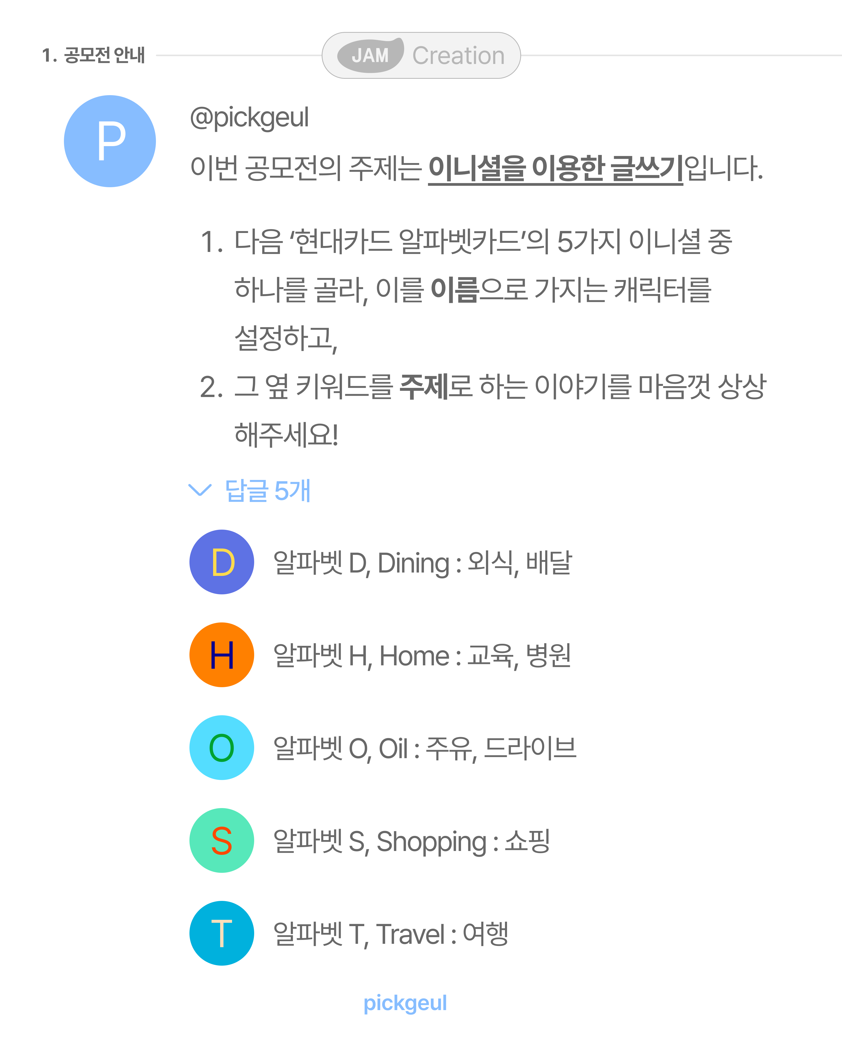 - 단, 당선작으로 선정된 글은 픽글 인스타그램에 처음으로 공개되어야 하며, 현대카드 알파벳카드와 연계된 간단한 인터뷰에 응해주셔야 합니다.