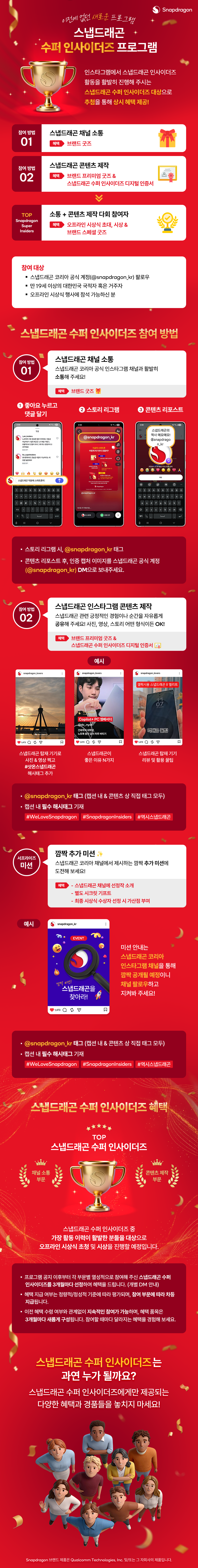 ▪️ 스냅드래곤 수퍼 인사이더즈 중 활동 이력이 활발한 분들을 대상으로 오프라인 시상식 초청 및 시상을 진행할 예정입니다.