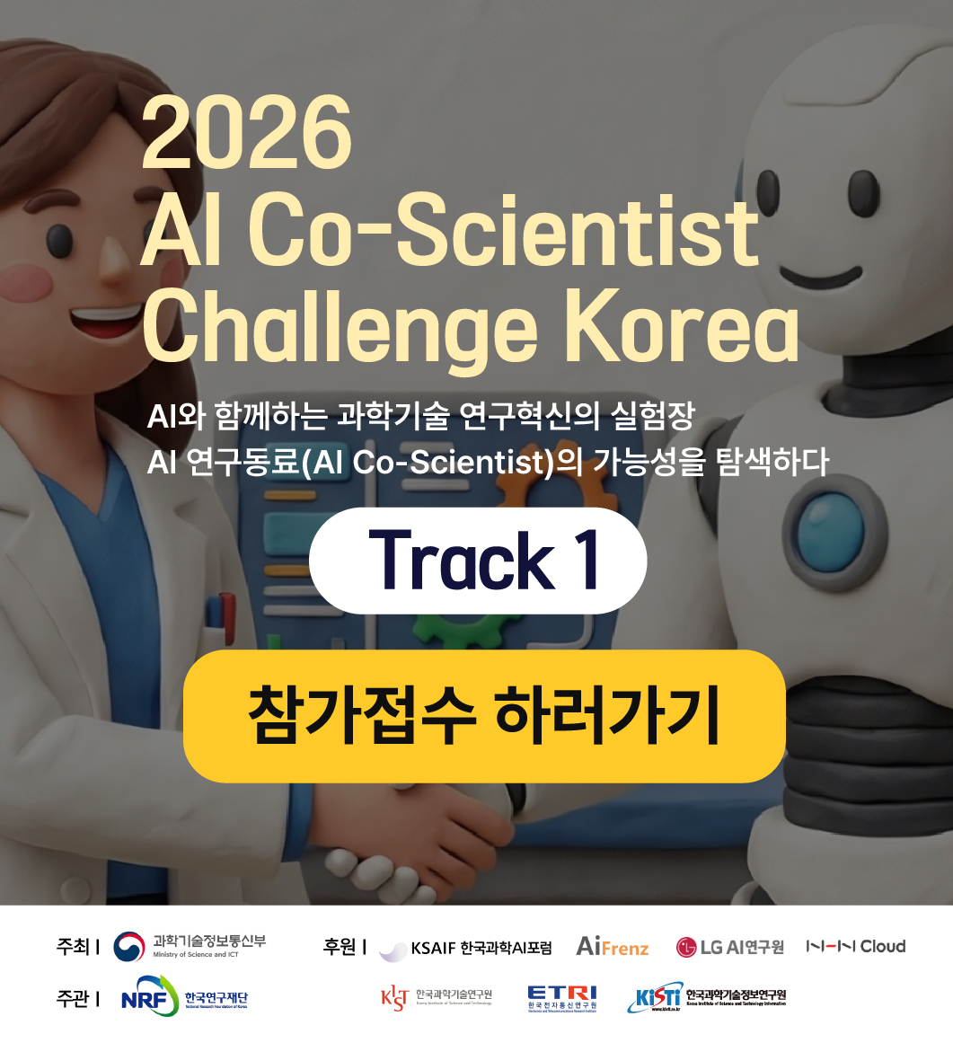 ○ 대회 개요 : 과학기술정보통신부와 한국연구재단이 주관하고 인공지능팩토리가 함께하는 「2026 과학기술 AI 활용 및 에이전트 개발 경진대회」가 개최됩니다. 본 대회는 AI 기술을 통해 과학적 발견을 가속화하고 연구 효율을 혁신할 수 있는 창의적인 솔루션을 발굴하고자 합니다.
