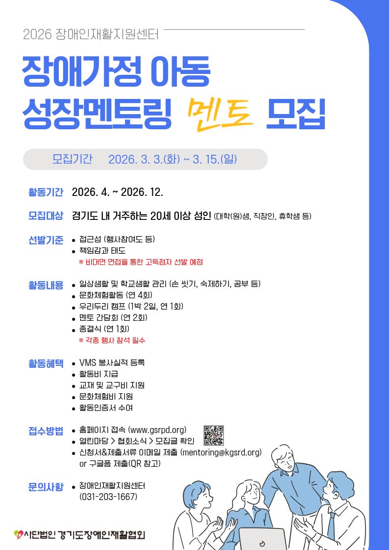 [경기도장애인재활협회] 2026년 장애가정아동 성장멘토링 멘토 모집