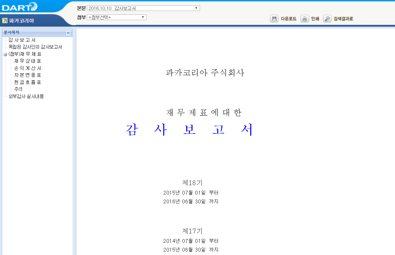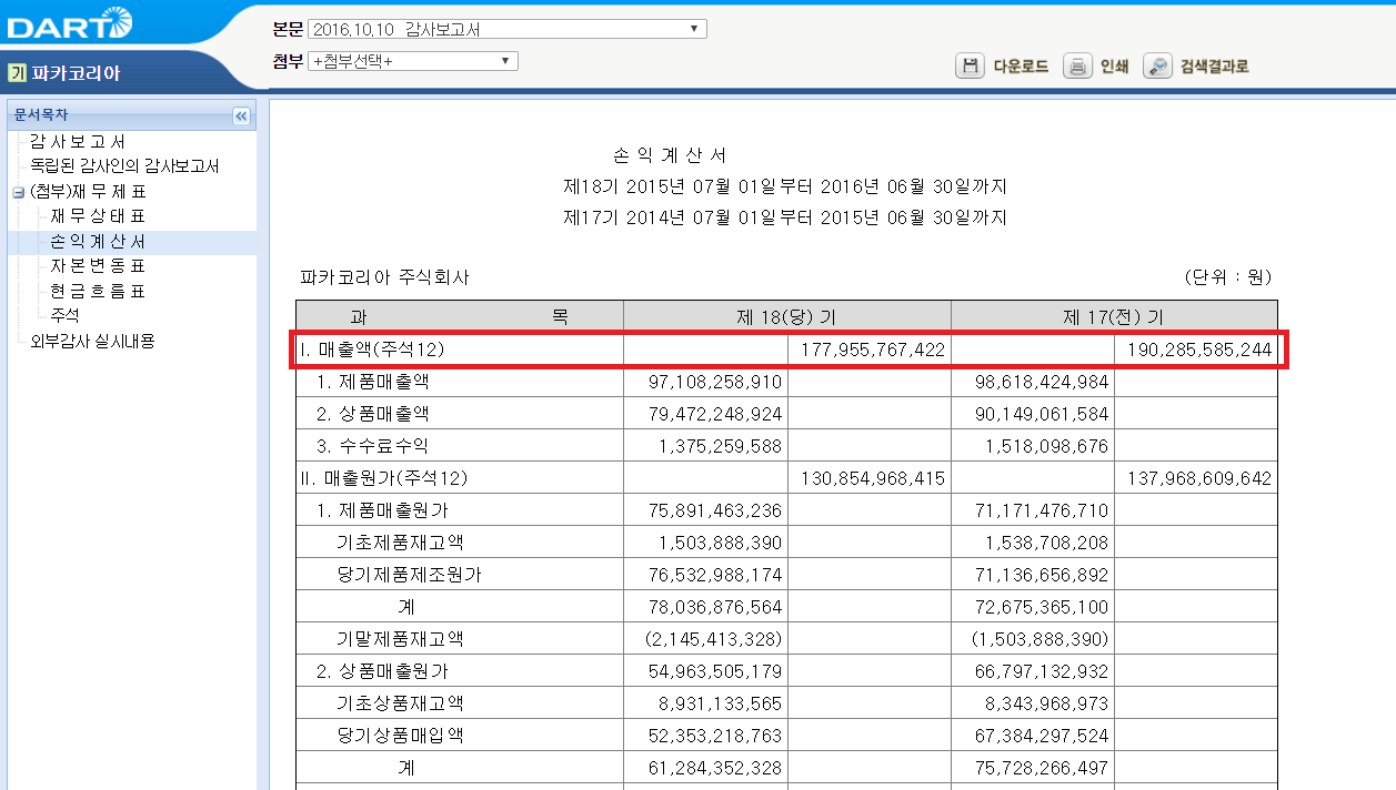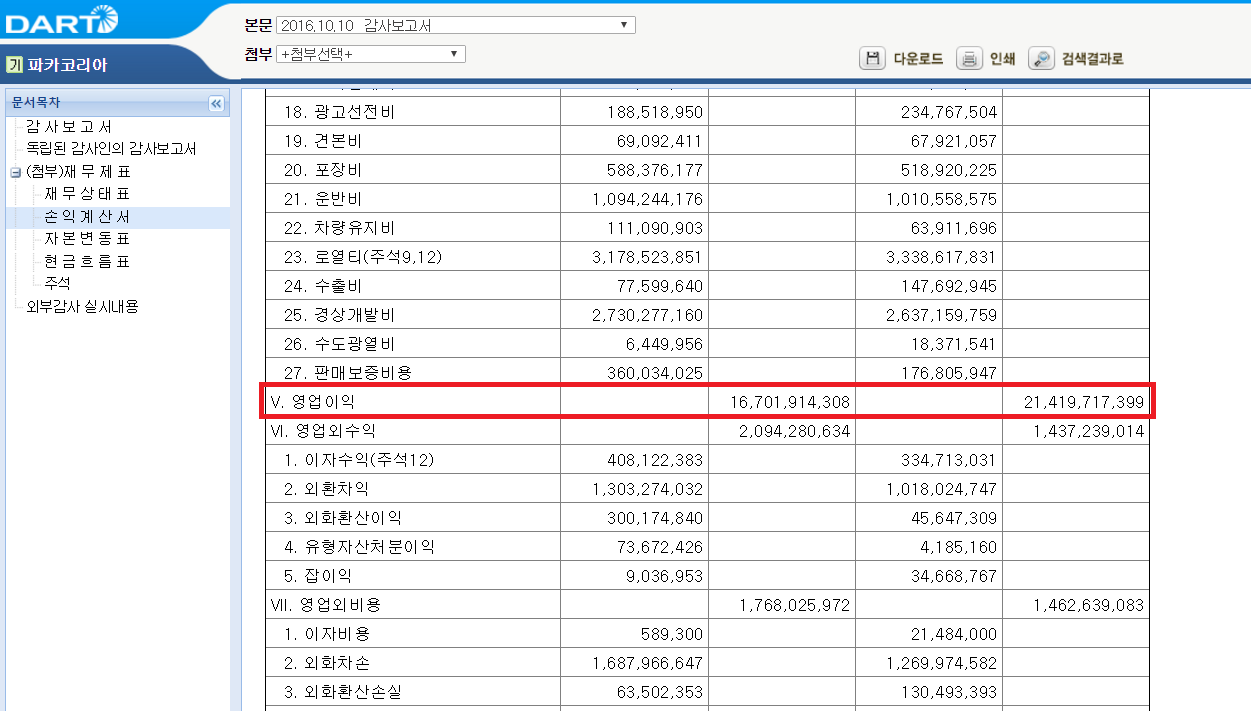 감사 보고서를 클릭하면 아래와 같은 내용이 뜹니다. 좌측 내용 중 손익계산서를 클릭하면,