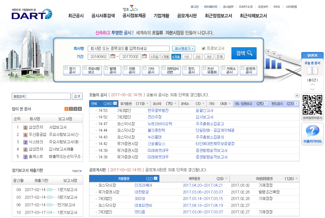 우선 'DART' 혹은 '전자공시'를 검색엔진에서 검색해 보세요. 홈페이지 메인화면은 다음과 같습니다.