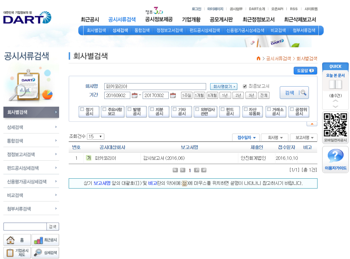그리고 중앙에 '회사명'을 입력하고 검색을 누르면 공시대상회사가 뜨고,