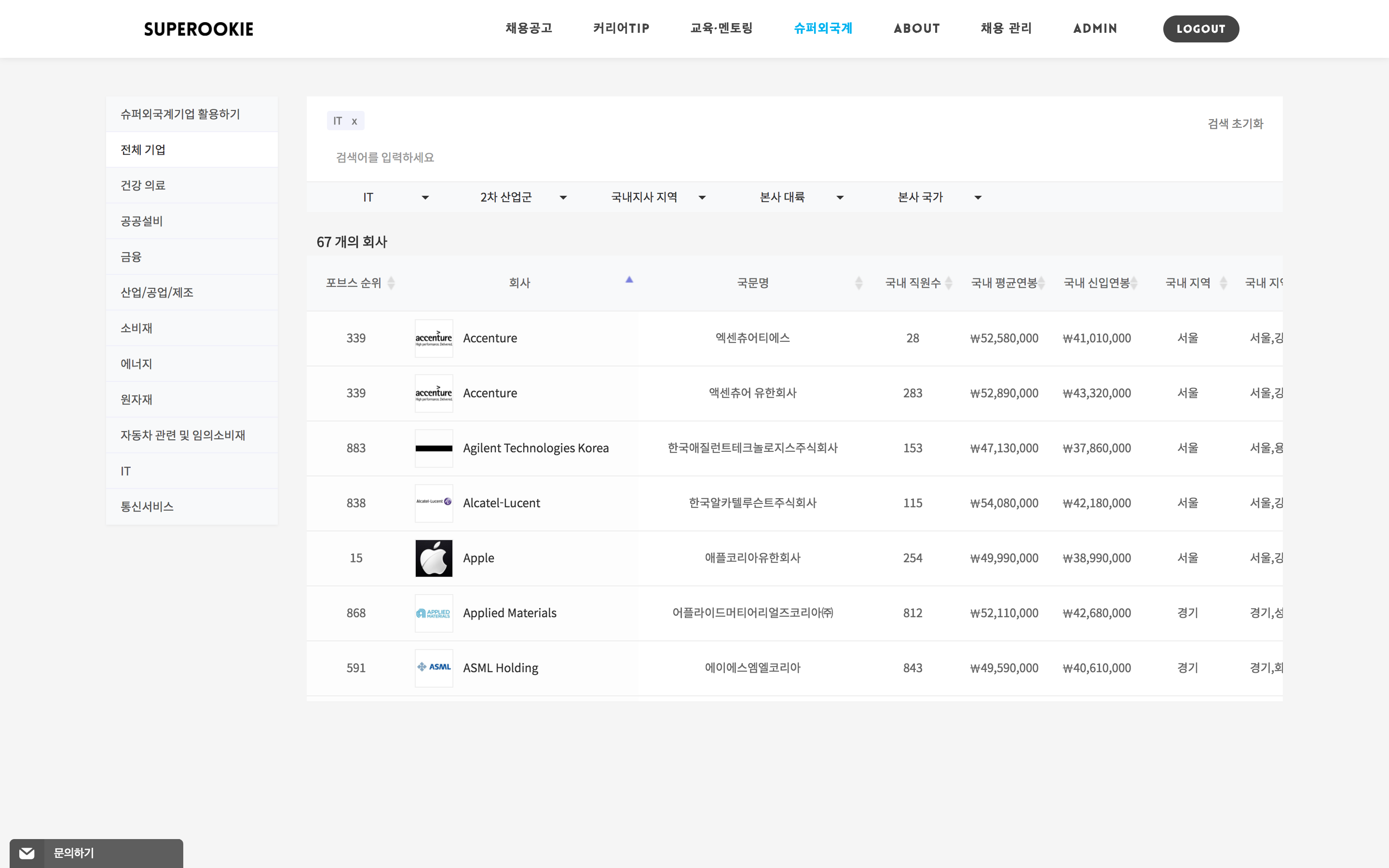하지만 취업 준비를 하면서 그 기업의 한국 지사가 있는지, 국내직원수는 몇 명인지, 신입 연봉은 어느정도 인지 다 찾아볼 시간이 부족합니다. 좋은 기업이 이렇게 많은데 학생분들이 잘 몰라 지원하지 못하는 상황이 안타까워 슈퍼외국계 리스트를 제작하게 되었습니다. 기존 포브스 리스트에서는 볼 수 없는 업종별 검색이 가능할 뿐 아니라 국내직원수, 평균연봉, 신입연봉, 입사율, 퇴사율, 본사 매출액, 자산규모, 영업이익, 브랜드가치를 한 눈에 볼 수 있게 제작되었답니다. 물론 각 항목별로 필터 검색도 가능하구요! 이 리스트는 유료 서비스를 이용하시는 사용자에 한해 볼 수 있으며, 해당 리스트는 수시로 업데이트 할 예정입니다.