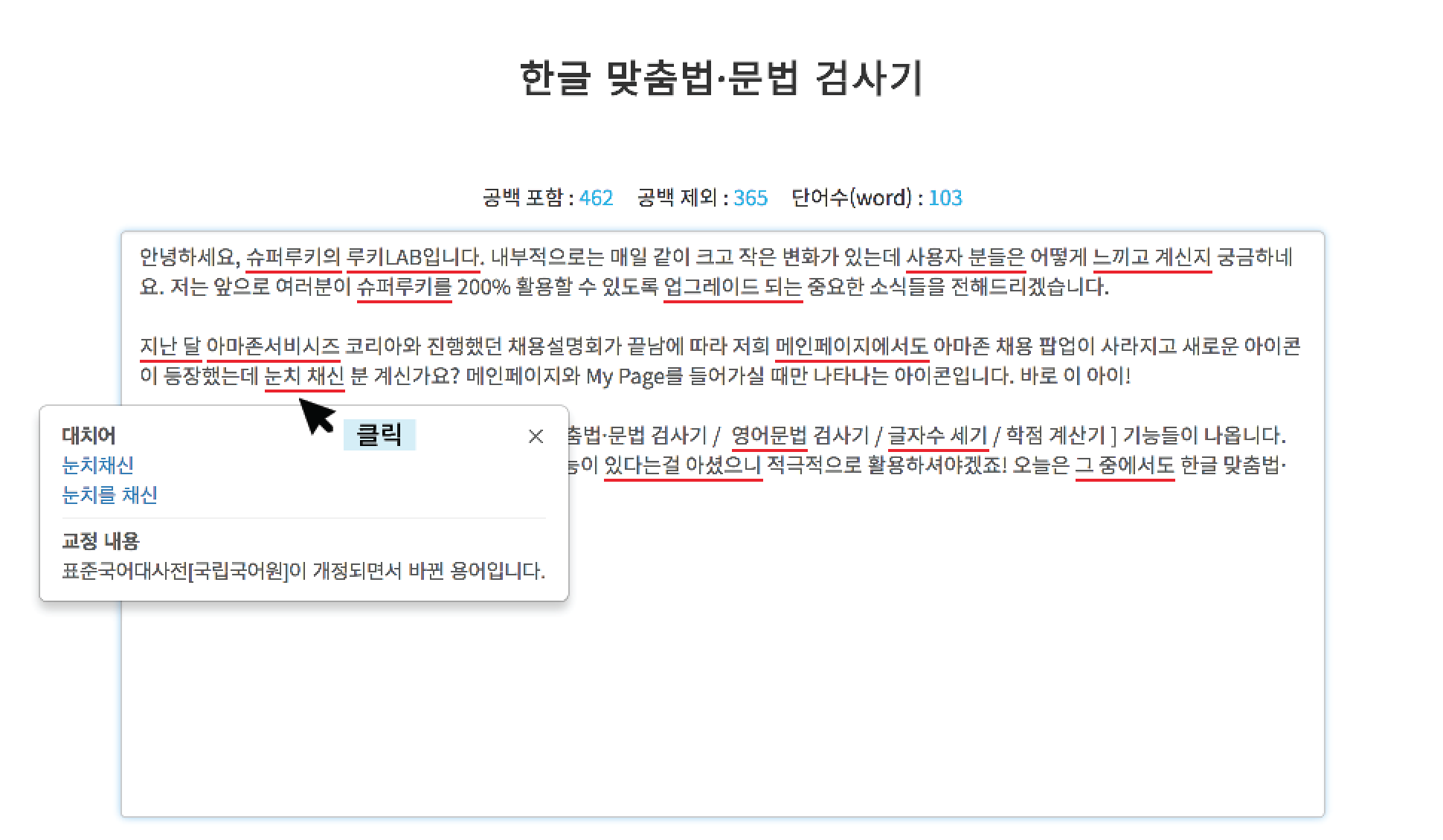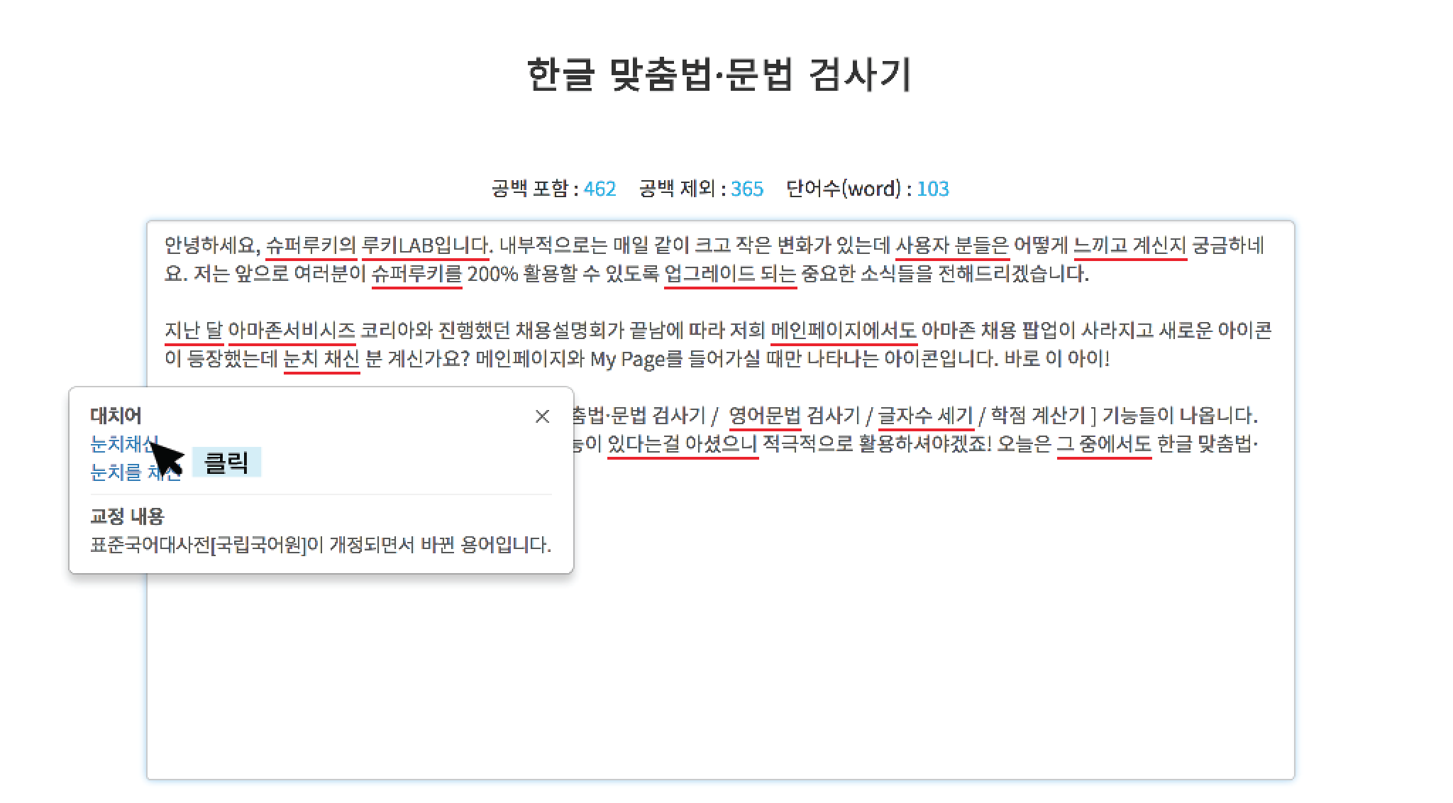 4. 맞춤법에 맞는 대치어를 제공하는데요, 문맥에 자연스러운 대치어를 클릭하시면 바로 적용이 됩니다. 기존에는 직접 수정을 하거나 복사+붙여넣기를 해야 했는데, 클릭만으로 바로 바뀌니 굉장히 편리하죠?