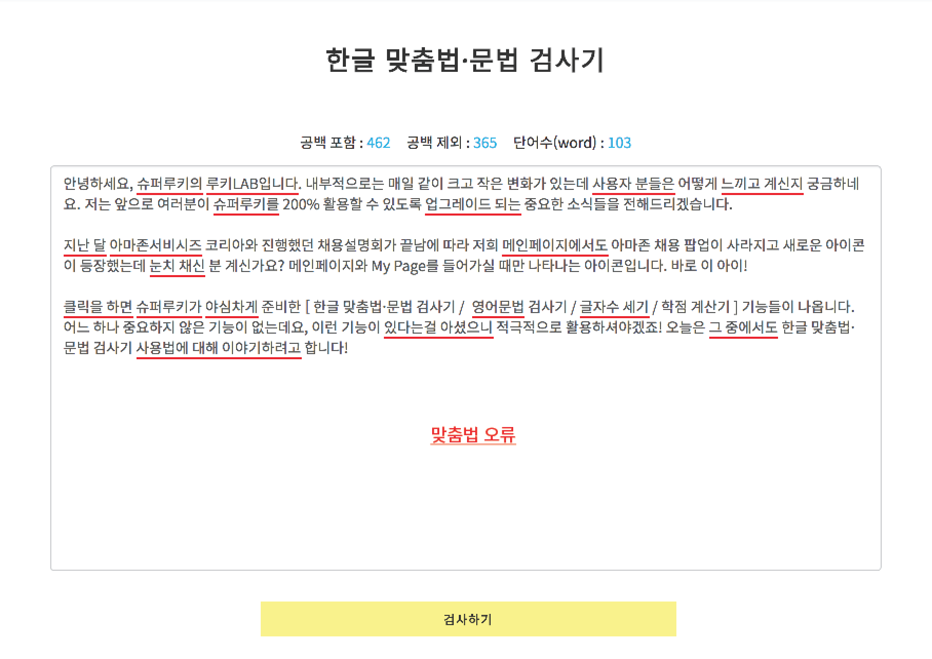 2. 아래와 같이 맞춤법에 어긋난 부분은 빨간 줄로 표시됩니다.