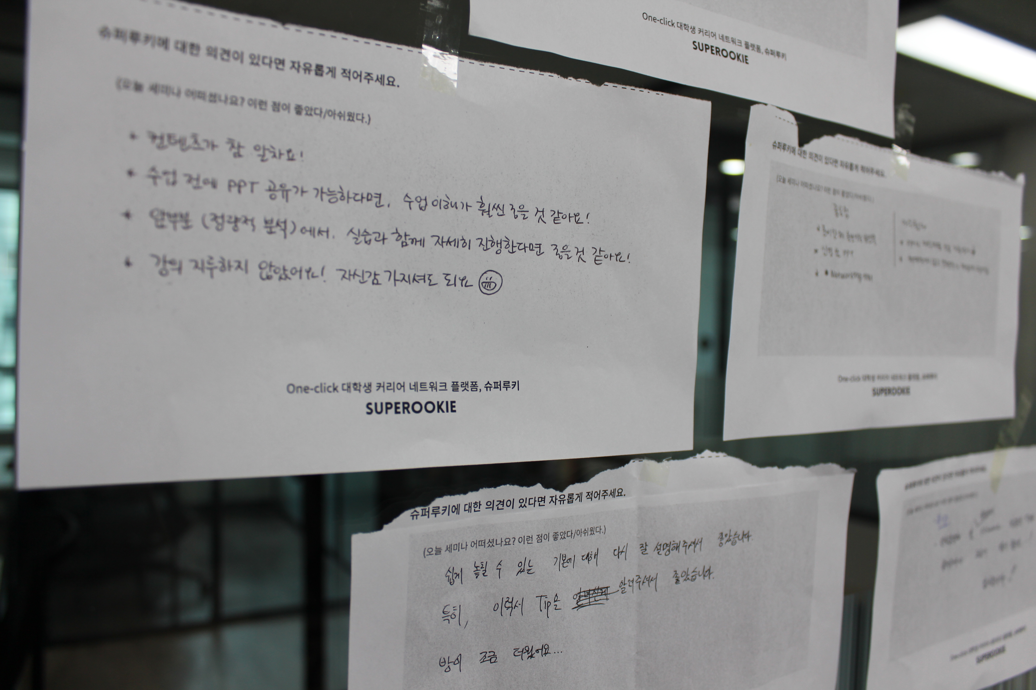 이렇게 1주차가 잘 마무리 되었고요, 학생분들에게 더 좋은 콘텐츠를 제공하기 위해 피드백도 받아 보았습니다. 저희 사무실 유리벽에 붙여놓고 하루종일 고민하고 있습니다. 어떻게 다음에 더 도움을 드릴 수 있을지를요! 앞으로도 더 많은 관심과 솔직한 의견 주시기 바랍니다. 여러분과 함께 할 때 더 좋은 슈퍼루키가 될 수 있으니까요. 그럼 오늘도 좋은 하루 되세요~! ![]()