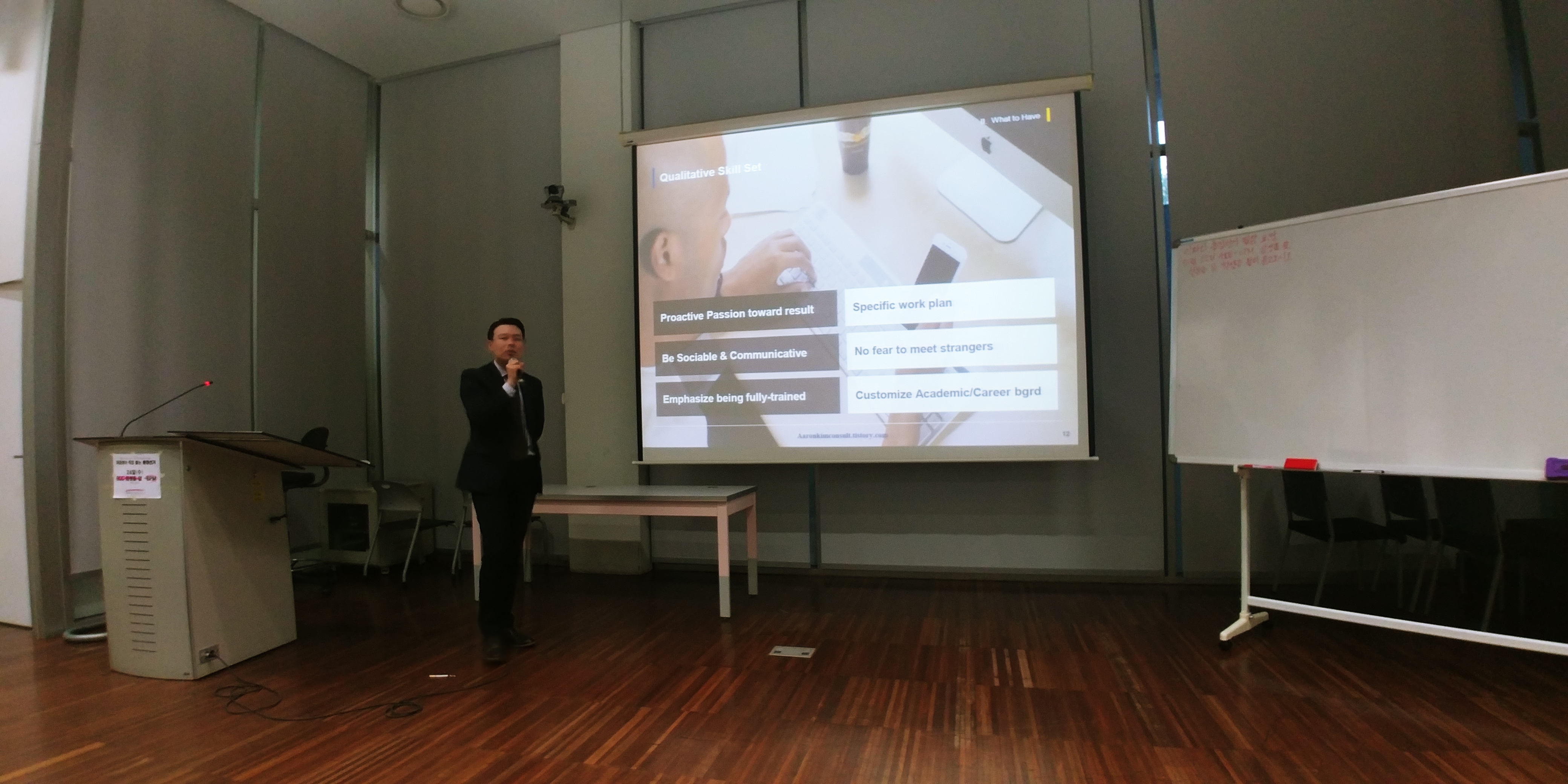 마지막 멘토로 나와 주신 분은 이번 세미나에 특별하게 모시게 된 GMAC의 아시아 디렉터 Jason Lawrence 멘토님 입니다. 이전에는 서진 멘토님께서 계속해서 발표를 해주신 데 이어 이날은 Jason 멘토님이 영문 이력서를 잘 쓰는 팁과 더불어 인사담당자들이 좋아할 resume 구조를 알려주셨습니다. 또한, MBA 과정이 해외 취업에 어떠한 도움을 줄 수 있는지에 대한 설명을 해주셨습니다. 여유로운 진행과 재치 있는 강연으로 마지막 순서임에도 불구하고 많은 학생분이 집중해서 경청하는 것을 느낄 수 있었습니다. 강연 후 멘토링 시간에 찾아온 학생분들의 resume를 직접 봐 주시고 질문들에 대하여 직접 컴퓨터로 관련 내용을 찾아서 상세히 설명을 해주셨습니다. 다음에도 한국에 오시게 된다면 슈퍼루키에서 꼭 모시도록 노력하겠습니다.