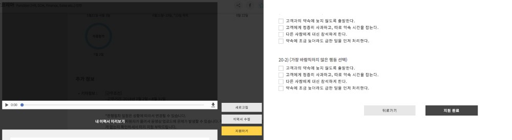 여기서 20개의 문항을 체크하시고 밑에 지원완료 버튼을 클릭해주시면 지원이 최종 완료됩니다.
