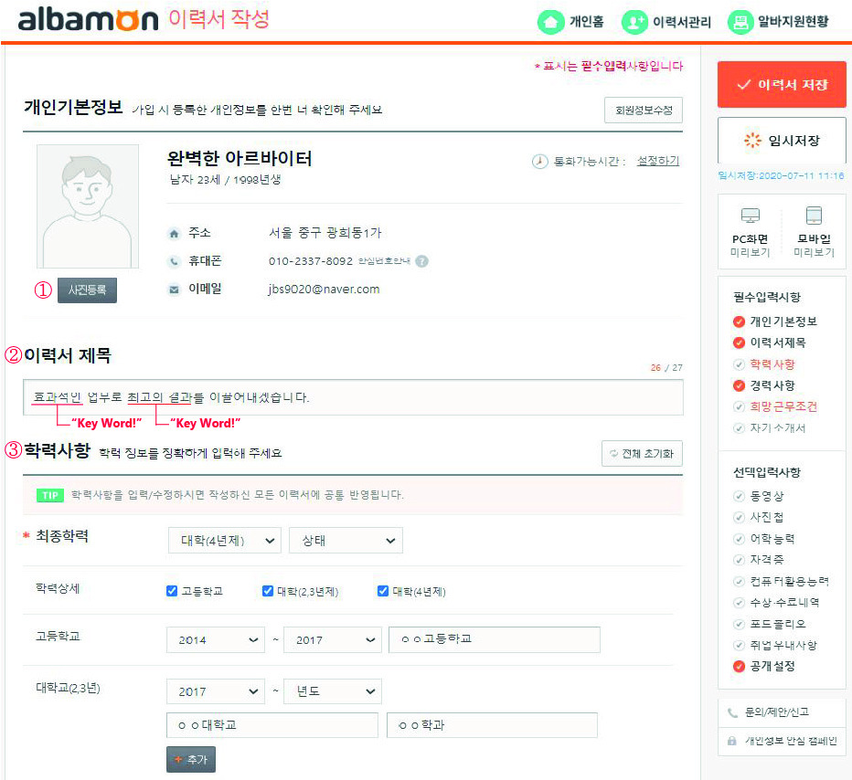 위의 사진을 보시면 "②이력서 제목"란에 두 개의 키워드를 밑줄 쳐 놓았습니다.