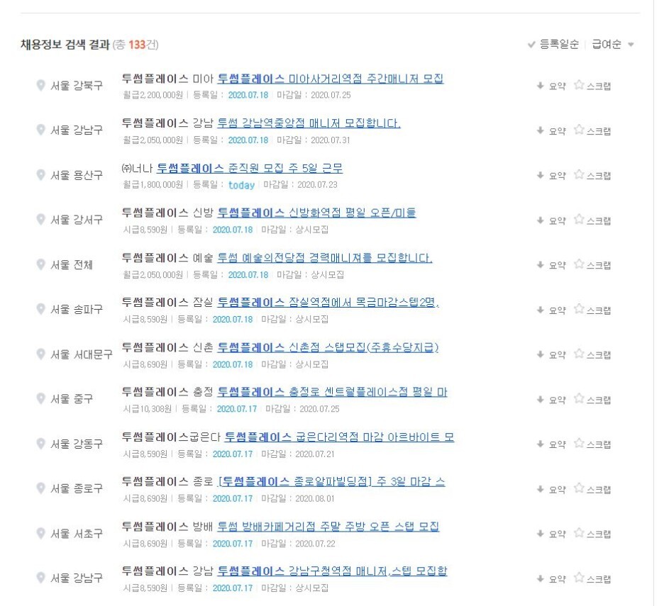 그러면 이렇게 지정한 지역 내의 투썸플레이스 채용 공고를 확인할 수가 있습니다.