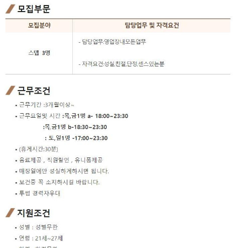 왜냐하면'매장일에만 성실하게 하시면 됩니다.'라고 문구를 넣은 것은 일단 성실하기만 하면 매장에서 일어난 실수나 잘못한 것에 대해서 충분히 이해해줄 수 있다는 의미까지 담고 있다고 보기 때문입니다.