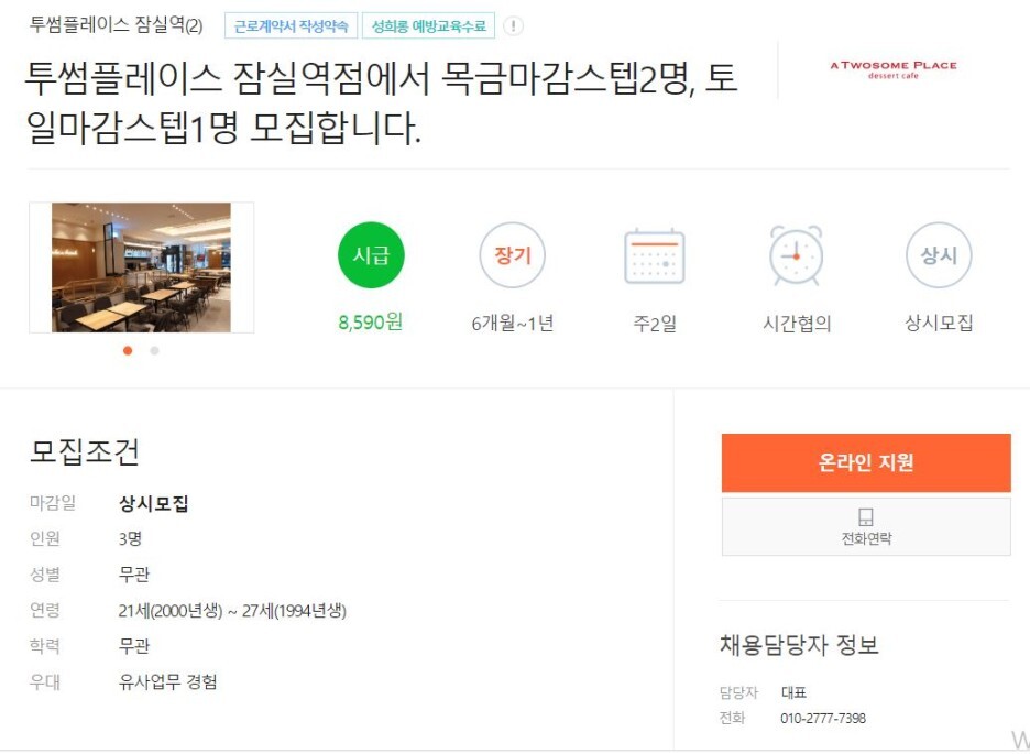 저는 채용 공고 목록 중에 여섯 번째에 있는'투썸플레이스 잠실역점에서 목금마감스텝2명'공고를 선택하겠습니다.