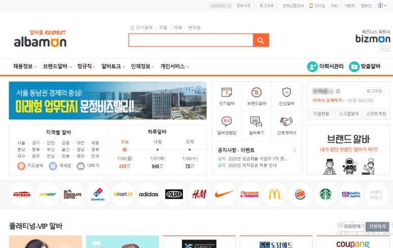 처음 알바몬에 접속하게 되면 보이는 메인 페이지입니다.