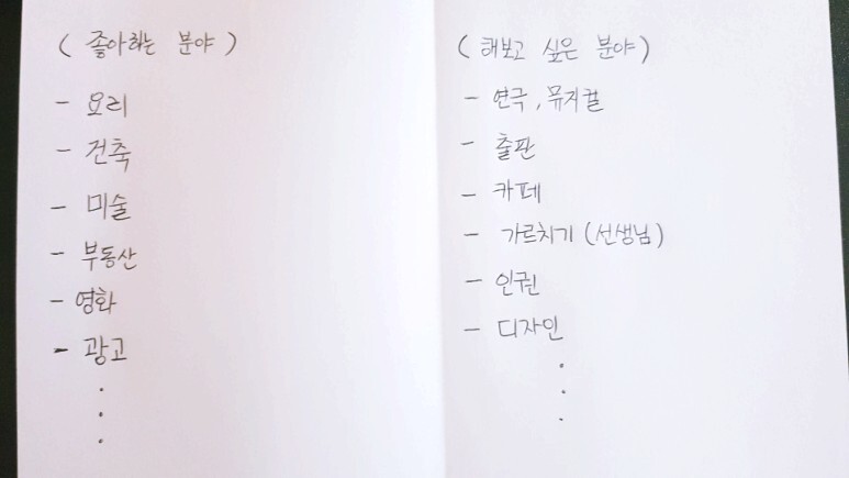 그러고 나서 종이에 펜으로 직접 자신이 좋아하는 분야의 일을 모두 적어보는 겁니다.