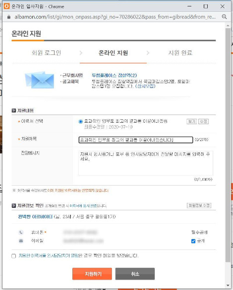 위의 형식으로 전달메시지까지 적었다면 적은 문장을 맞춤법 검사까지 마친 뒤에 꼼꼼히 확인을 하고, 최종적으로 "지원하기"버튼을 누르도록 합니다.