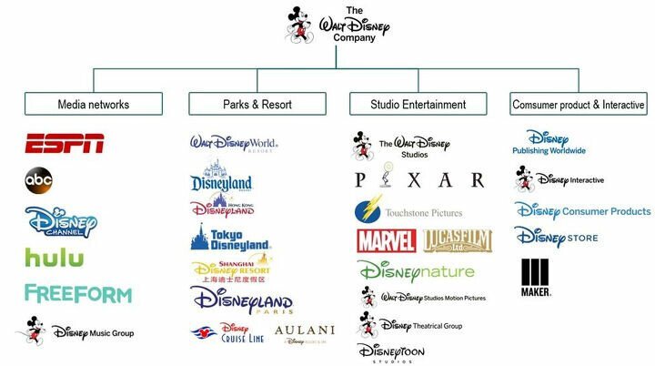 각 부분에 너무 많은 자회사들이 있어서 디즈니는 거의 모든 미디어 포트폴리오를 가지고 있다고 생각하면 된다.