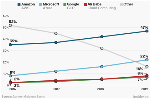 클라우드 서비스 시장 점유율은 2020년 4분기 아마존의 AWS (Amazon Web Service)가 32%로 1위이며 2위는 마이크로소프트의 애저 20%, 구글이 9%로 3위이다.