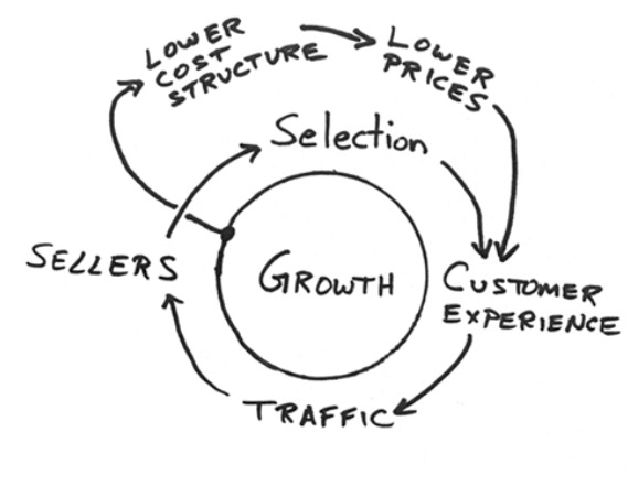 아마존의 CEO 제프 베조스는 레스토랑에서 투자자와 식사를 하는 도중에 비즈니스 모델에 대한 문의를 받고 냅킨에다가 하나의 그림을 아래와 같이 그렸다고 한다.