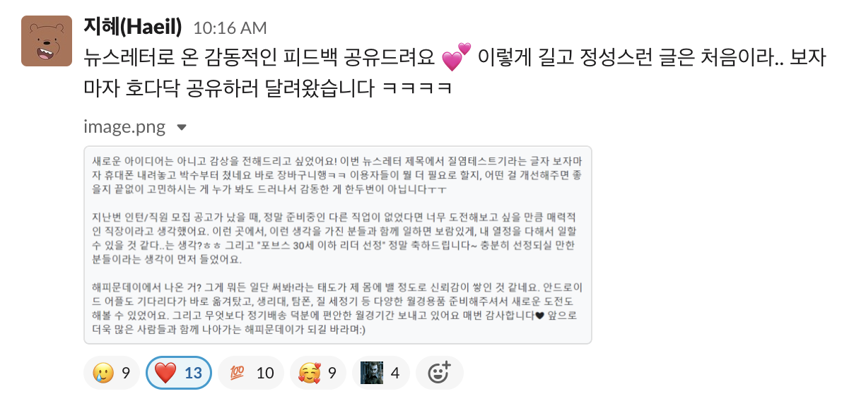 한 번은 뉴스레터 통해서 정말 장문의 애정이 담긴 피드백이 온 적이 있었어요. 해피문데이의 제품, 헤이문, 콘텐츠 모든 요소를 다 총망라한 피드백이었는데, 어떻게 고객이 우리 브랜드에게 이만큼의 애정을 가지게 되었을까 하며 구성원으로서 뿌듯함을 느끼는 시간이었습니다.