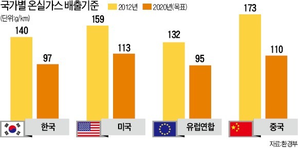 < 국가별 차량 온실가스 배출기준 km당 g으로 측정 > (출처 : 구글 이미지)