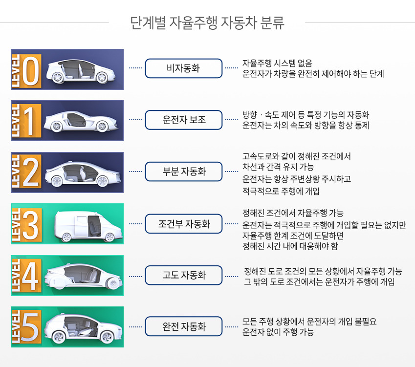 레벨 4부터는 운전자의 개입도 불필요하고 레벨 5는 운전자가 필요하지 않은 상태가 된다.