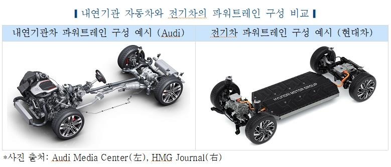 < 내연기관차와 전기자동차 파워트레인 구성 비교 > (출처 : 구글 이미지)