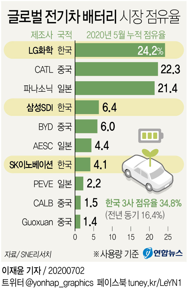 글로벌 전기차 배터리 시장에서도 한국 기업들의 기술력이 인정받고 있고 시장 점유율에서도 한국 3사가 34.8%로 높은 점유율이다. 이는 전년 동기(같은 기간) 대비해서 두 배나 성장한 것으로 시장 증가와 더불어 한국 기업의 매출 확대에도 좋은 소식으로 보인다.