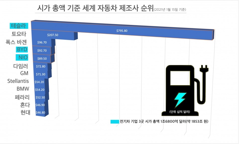 아직 전기차는 내연기관차에 비해서 판매량이 적다. 그럼에도 불구하고 전기차를 주로 판매하는 기업들의 가치는 하루가 다르게 상승하고 있다.