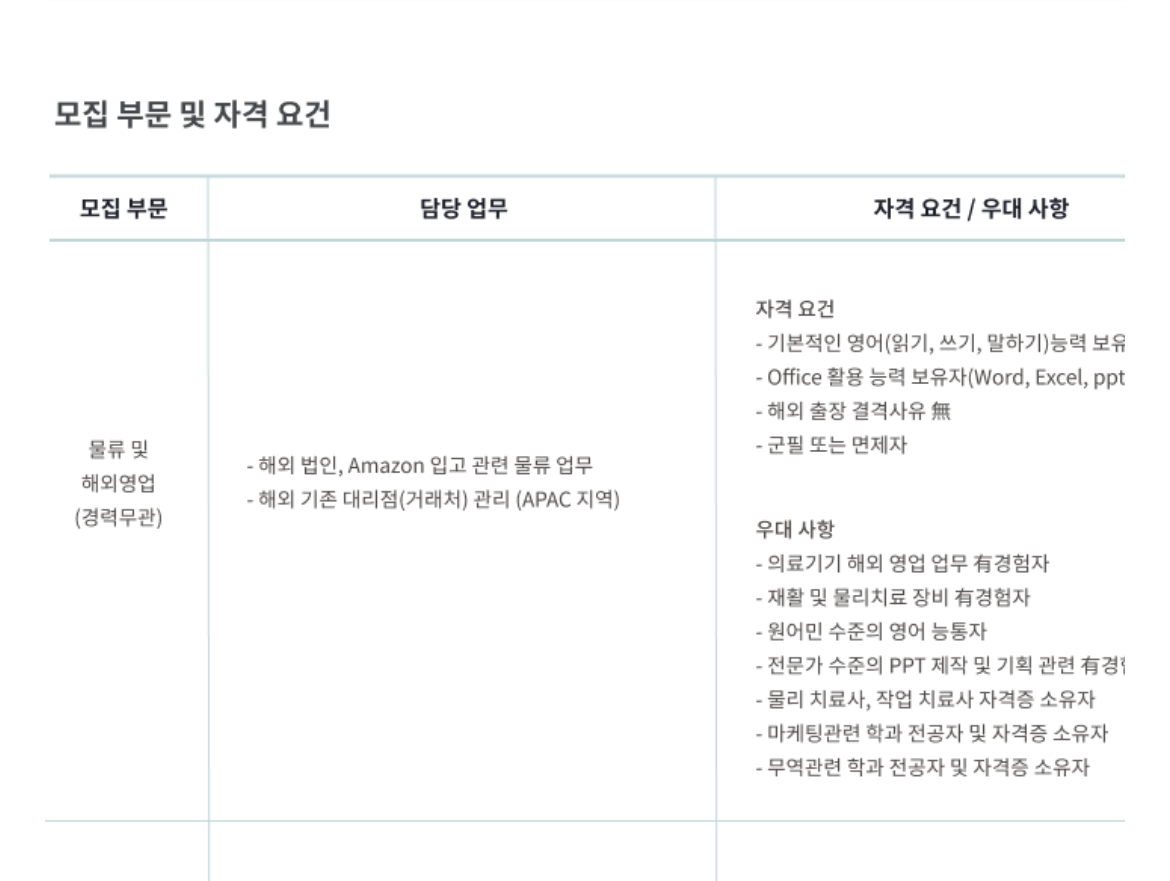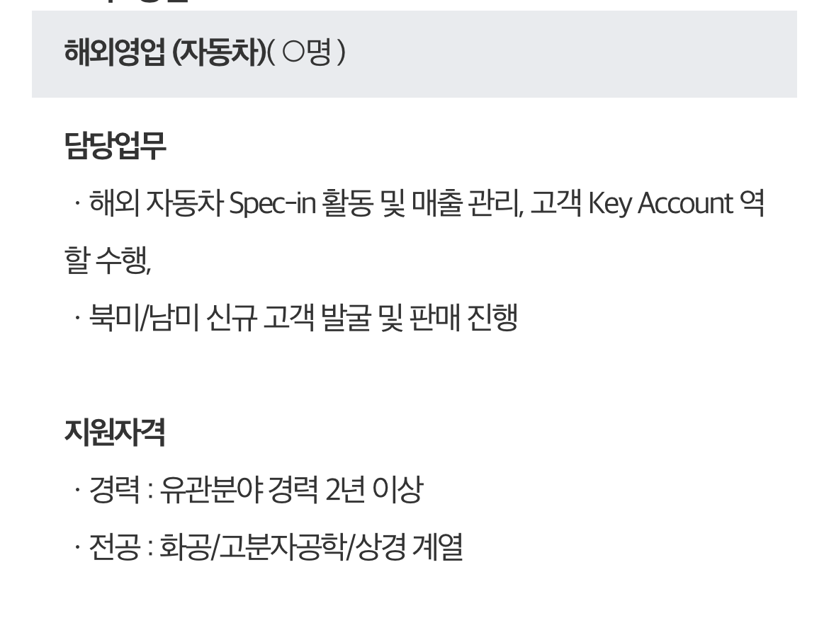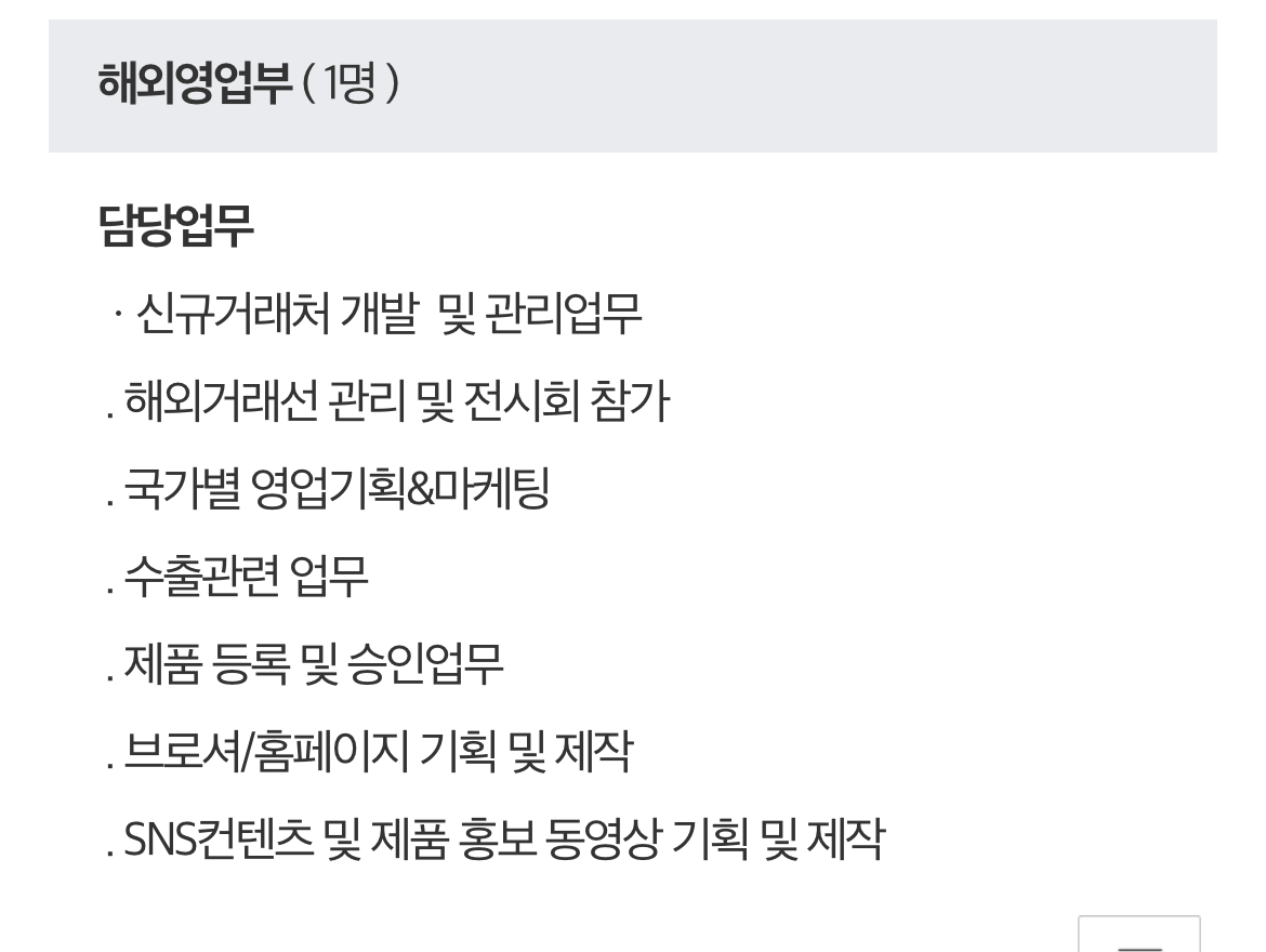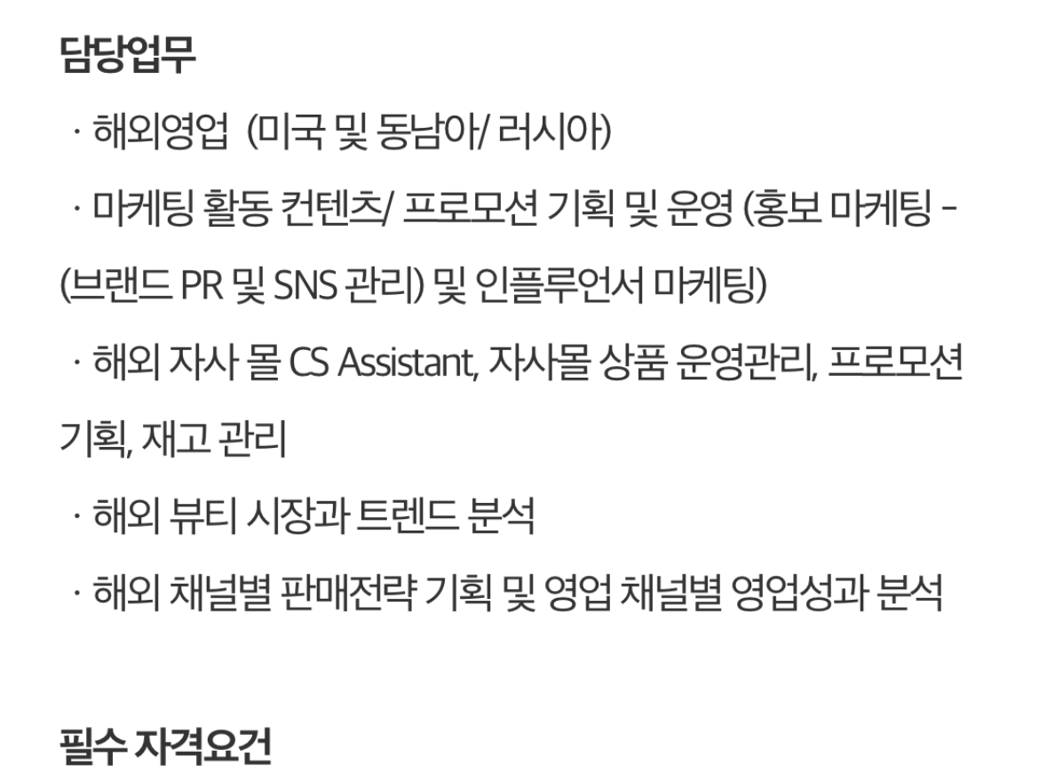 채용공고를 살펴보면 해외영업이라는 키워드로 검색했는데 상세 내용을 보면 어떤 일을 하는지 조금씩 다르죠? 또 경력직의 경우 담당하게 되는 업무가 또 조금씩 다르고요.