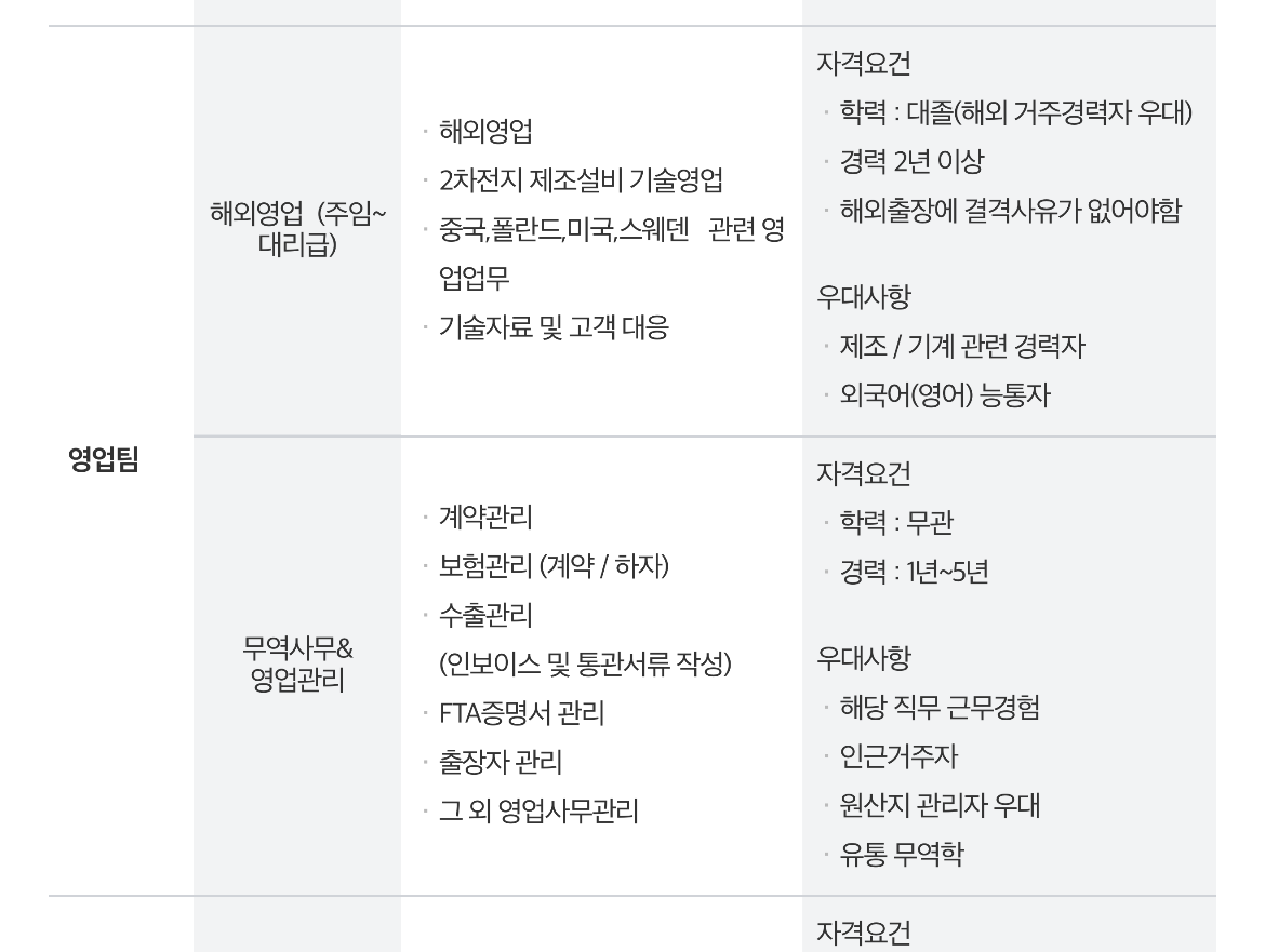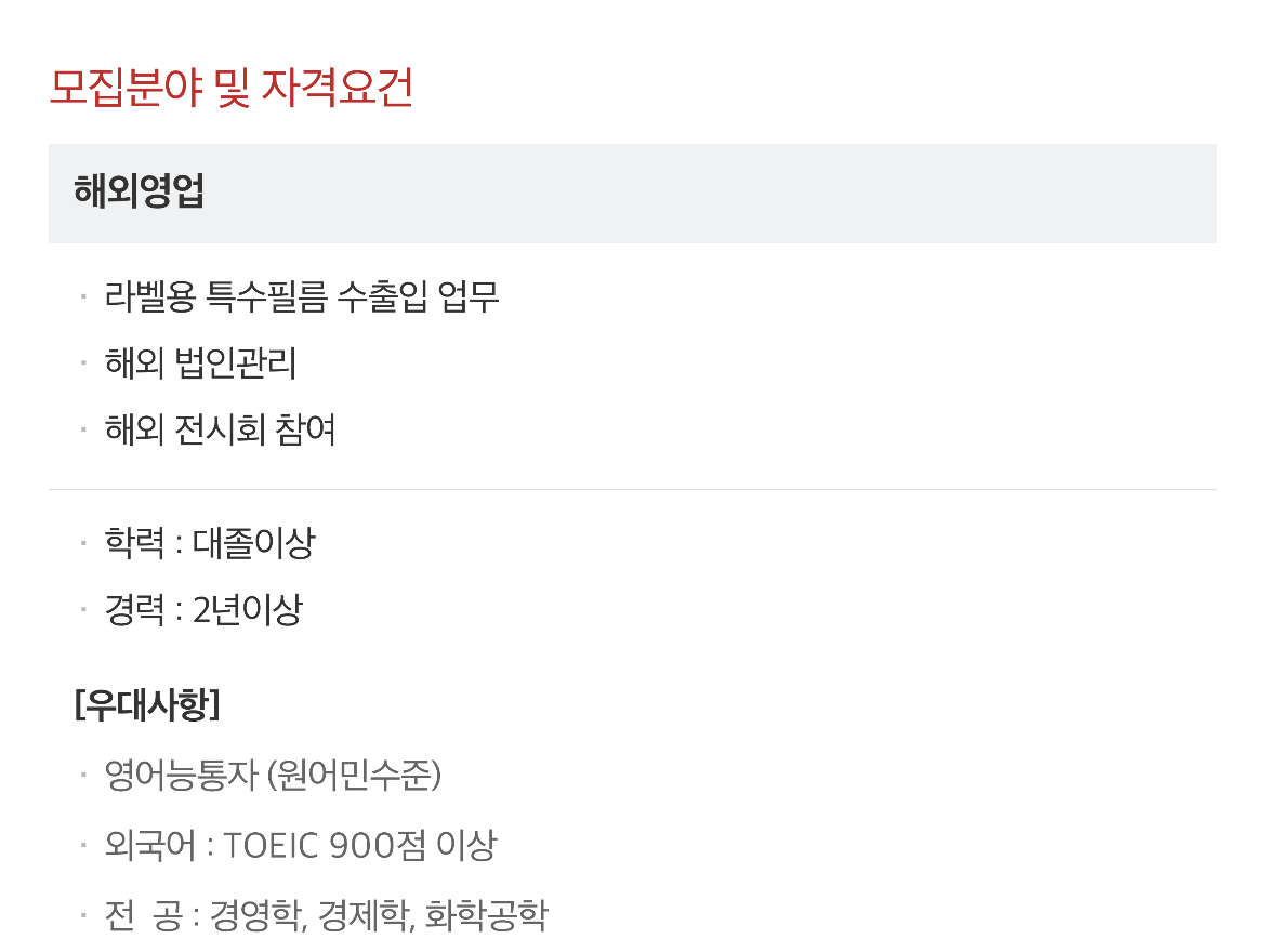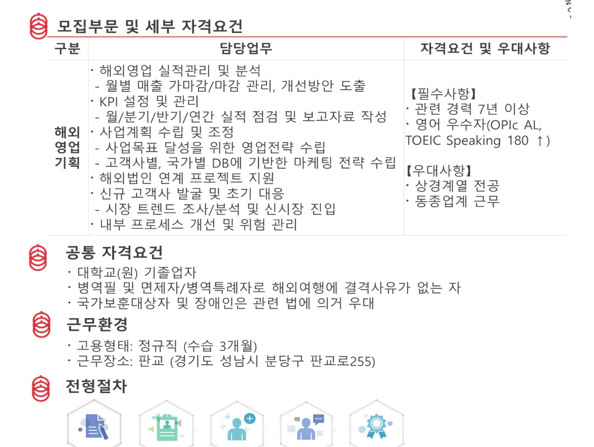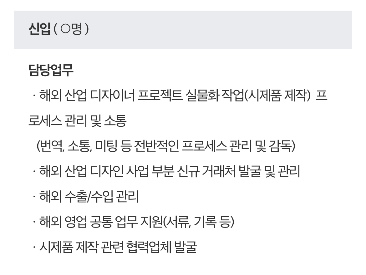 채용공고를 살펴보면 해외영업이라는 키워드로 검색했는데 상세 내용을 보면 어떤 일을 하는지 조금씩 다르죠? 또 경력직의 경우 담당하게 되는 업무가 또 조금씩 다르고요.