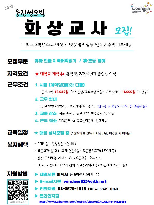 [재택][화상교사] 웅진씽크빅 유아 한글 & 국어책읽기, 유초등 영어 교사