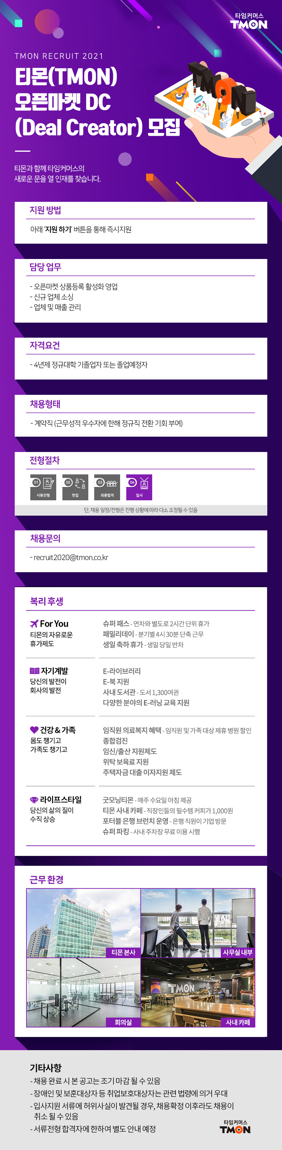 티몬(TMON)은 2010년 창립을 시작으로 이커머스 시장을 선도하는 기업입니다.