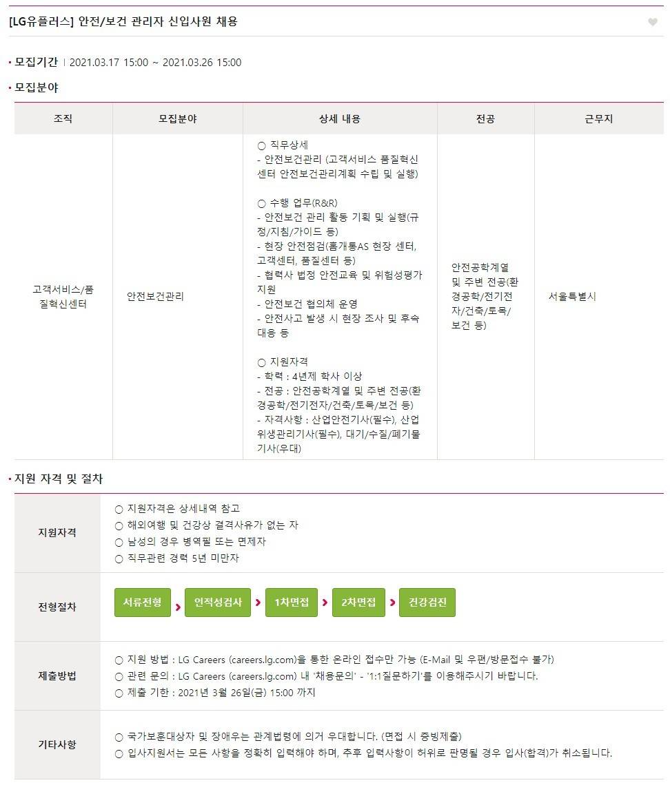 ○ 지원 방법 : LG Careers (careers.lg.com)을 통한 온라인 접수만 가능 (E-Mail 및 우편/방문접수 불가)