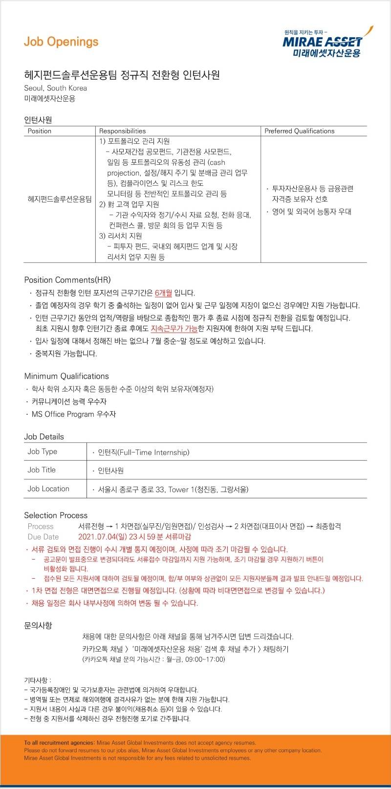 헤지펀드솔루션운용팀 정규직 전환형 인턴사원 채용