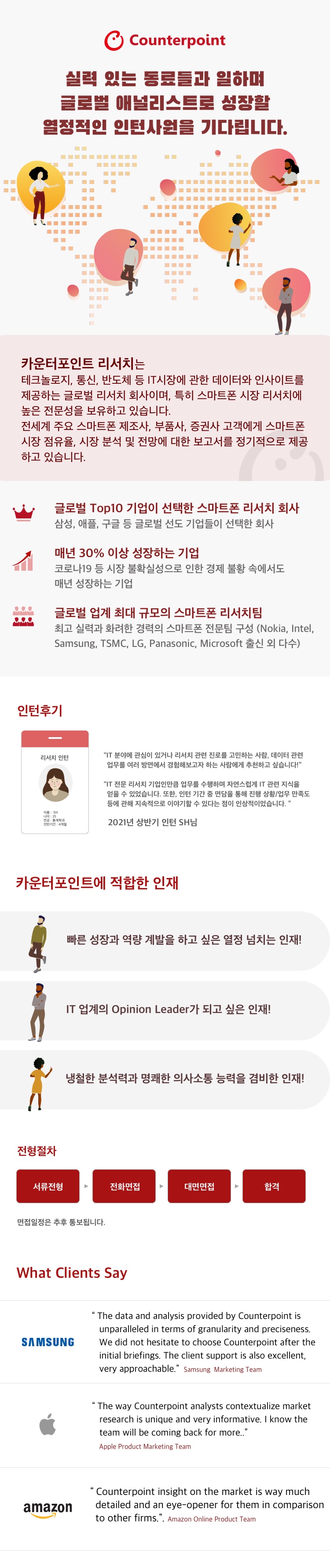 카운터포인트리서치는 테크놀로지, 통신, 반도체 등 IT시장에 관한 데이터와 인사이트를 제공하는 글로벌 리서치 기업이며, 특히 스마트폰 시장 리서치를 전문으로 하고 있습니다. 전세계 주요 스마트폰 제조사, 부품사, 증권사 고객에게 스마트폰 시장 점유율, 시장 분석 및 전망에 대한 보고서를 정기적으로 제공하고 있으며 이번에 리서치팀에서 함께 일할 인재를 찾고 있으니 많은 지원 바랍니다.