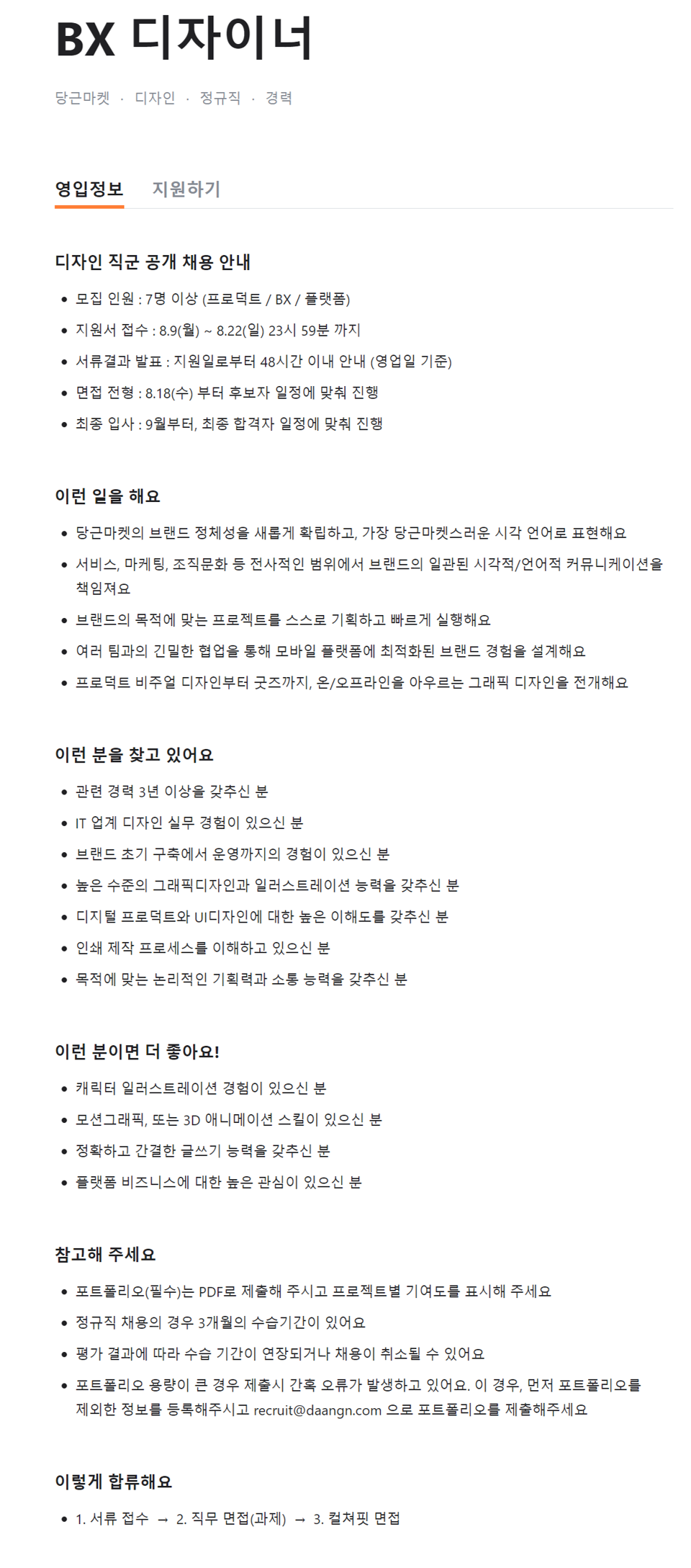 - 1. 서류 접수 → 2. 직무 면접(과제) → 3. 컬쳐핏 면접