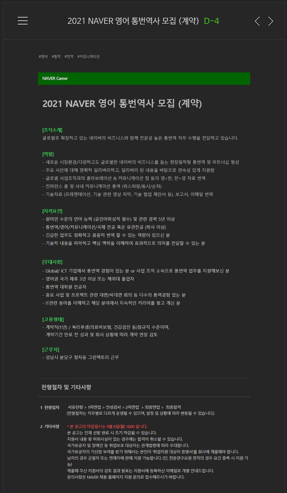 - 새로운 시장환경/다양하고도 글로벌한 네이버의 비즈니스를 돕는 현장밀착형 통번역 및 파트너십 형성