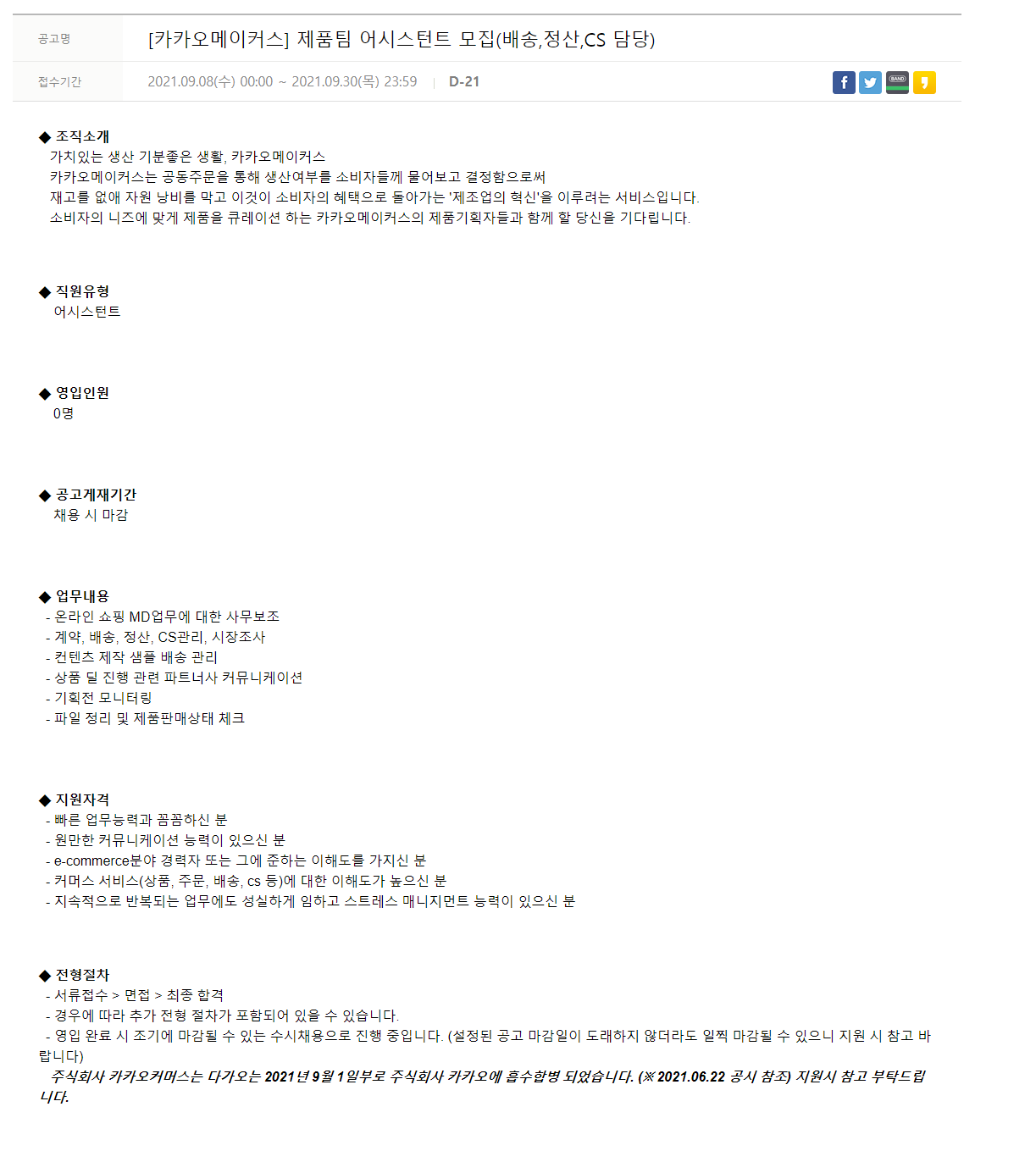 제품팀 (배송,정산,CS 담당) 어시스턴트 채용