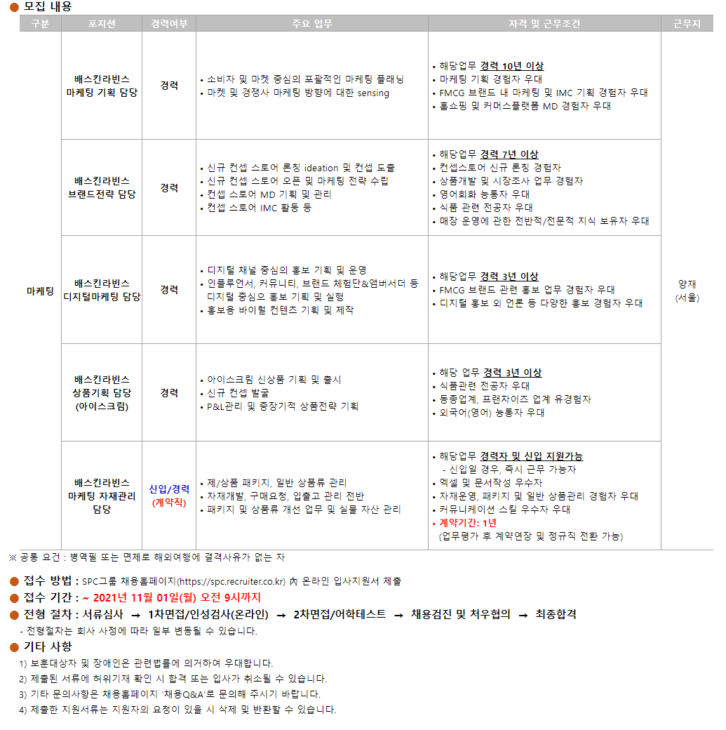 ● 접수 방법 : SPC그룹 채용홈페이지(https://spc.recruiter.co.kr) 內 온라인 입사지원서 제출