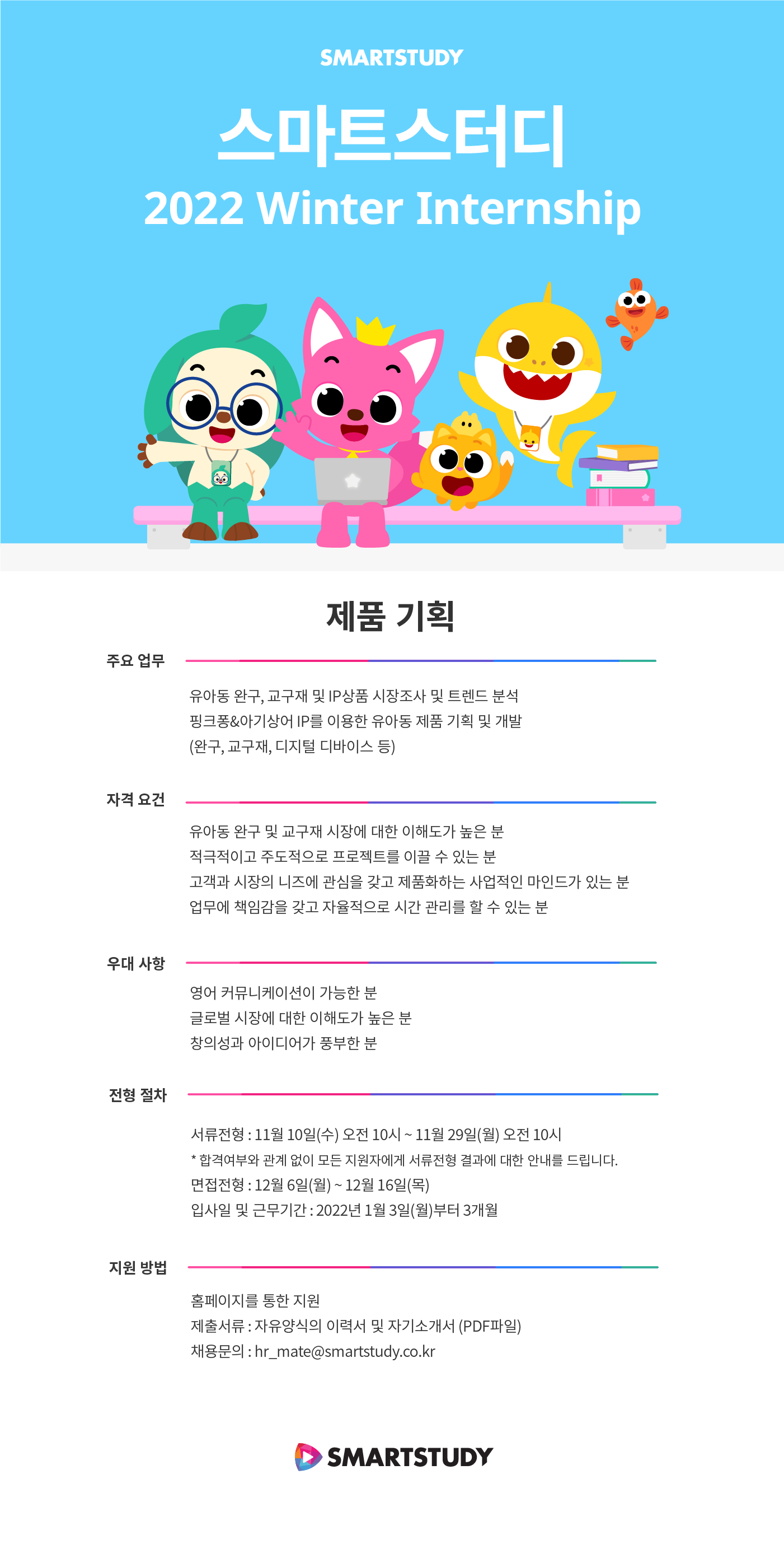 - 핑크퐁&아기상어 IP를 이용한 유아동 제품 기획 및 개발(완구, 교구재, 디지털 디바이스 등)