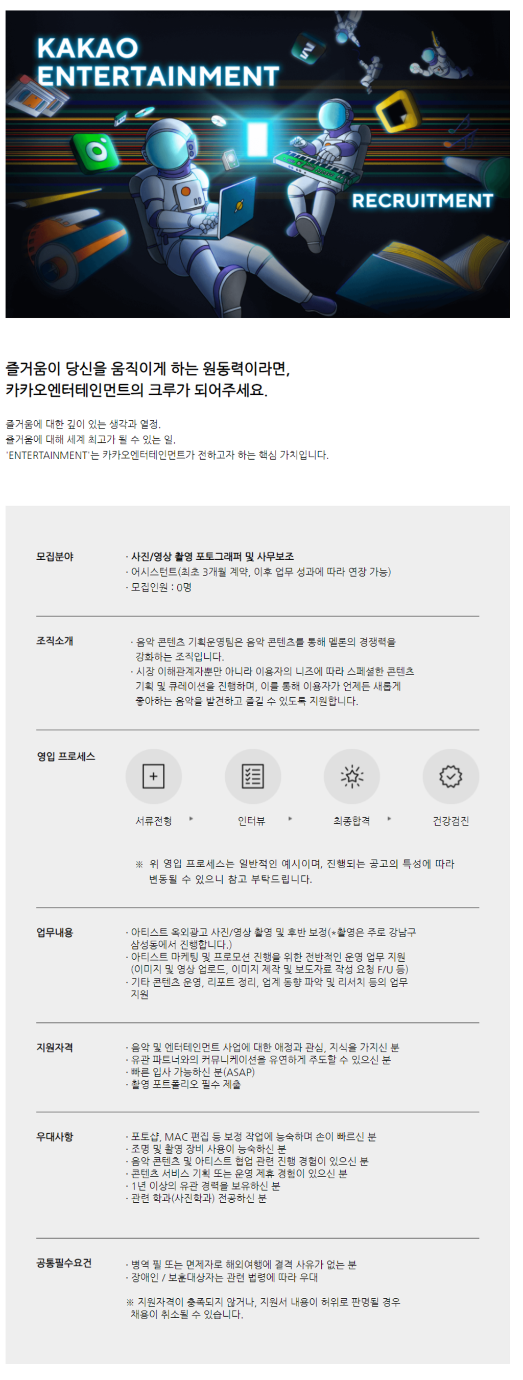 · 음악 및 엔터테인먼트 사업에 대한 애정과 관심, 지식을 가지신 분